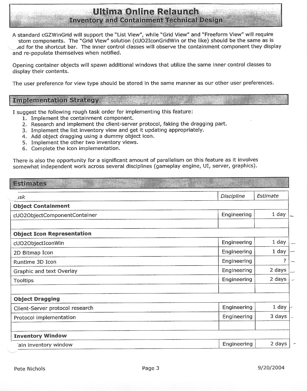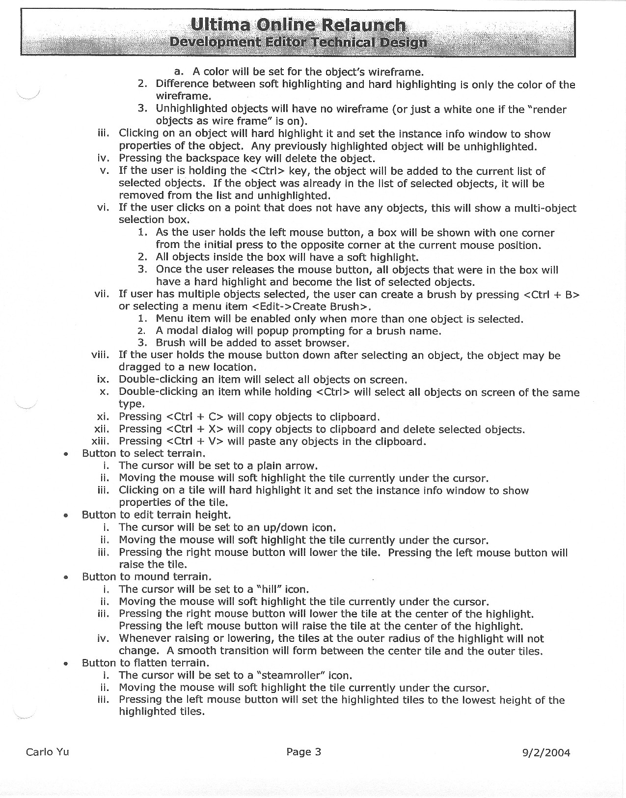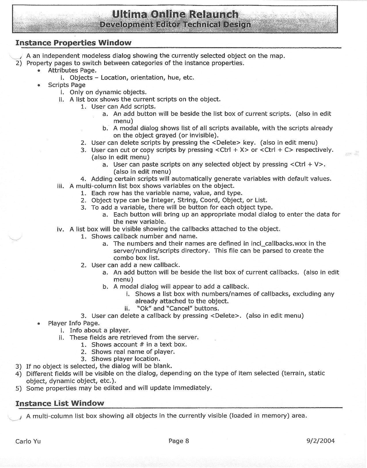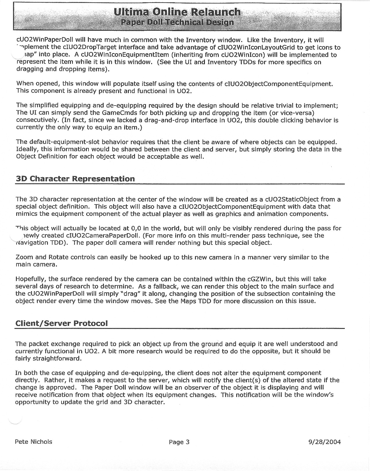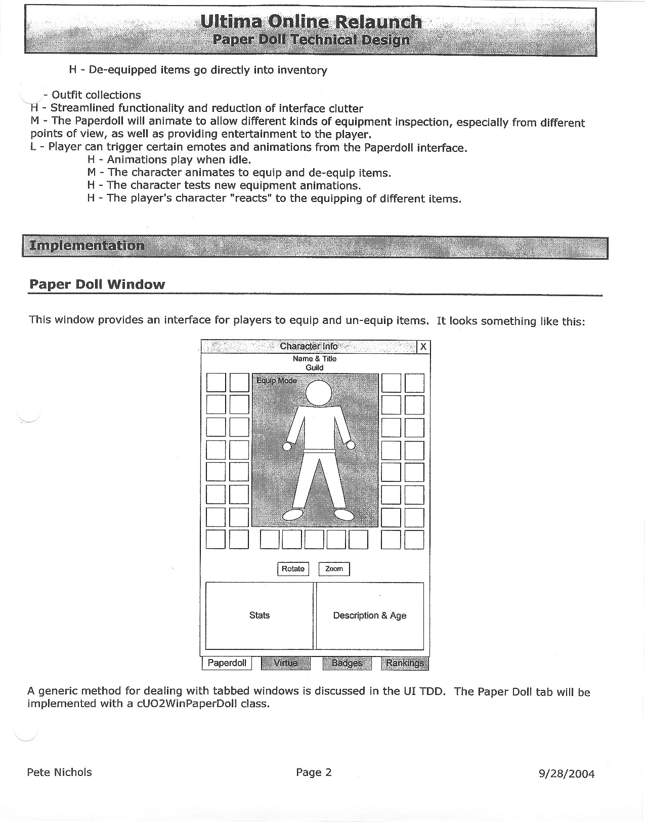 This document is dense, and disucsses almost all the technical details that would have concerned the Ultima Online 2 development team. Early in the document, for example, a comparison of different game engine technologies is performed, and it would appear that Maxis’ GZ engine (which powered The Sims 2, for example) had been chosen as the engine that would power the game. (The Renderware engine was chosen as a backup plan.) Later on in the document, the intentory UI and paperdolling system get discussed.