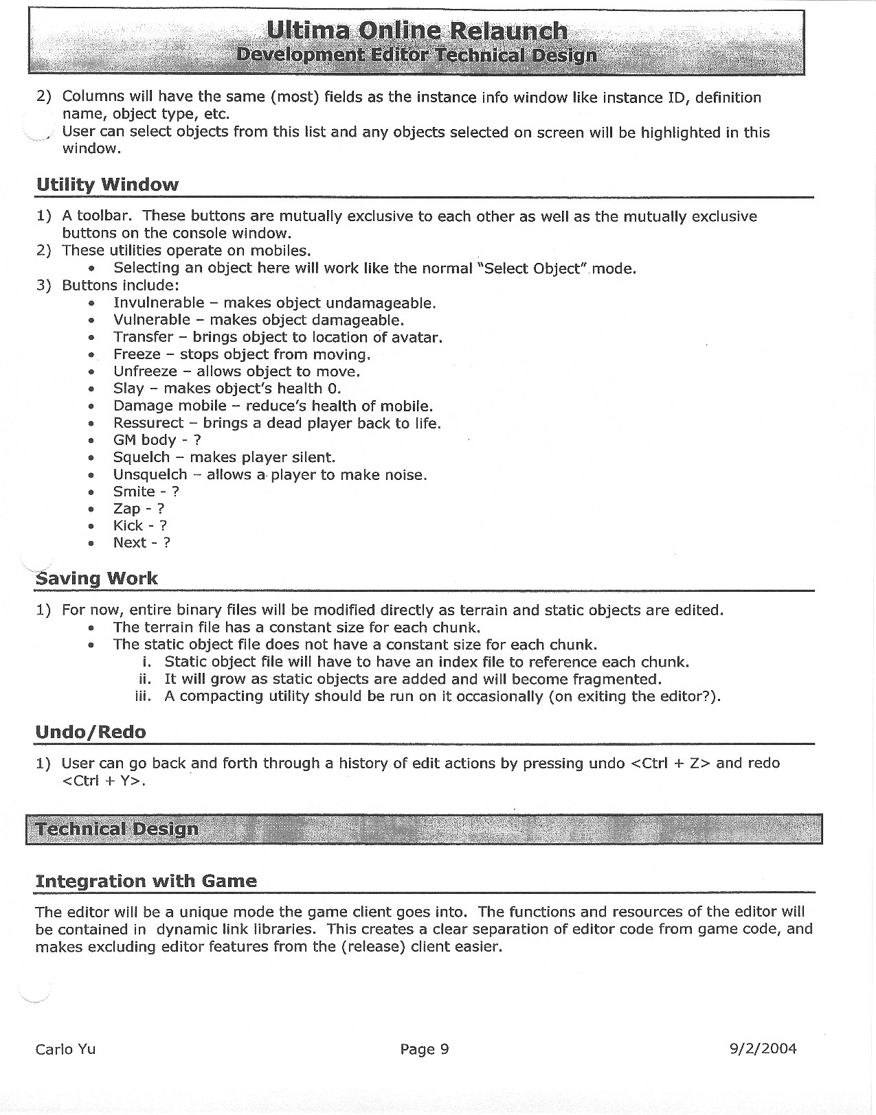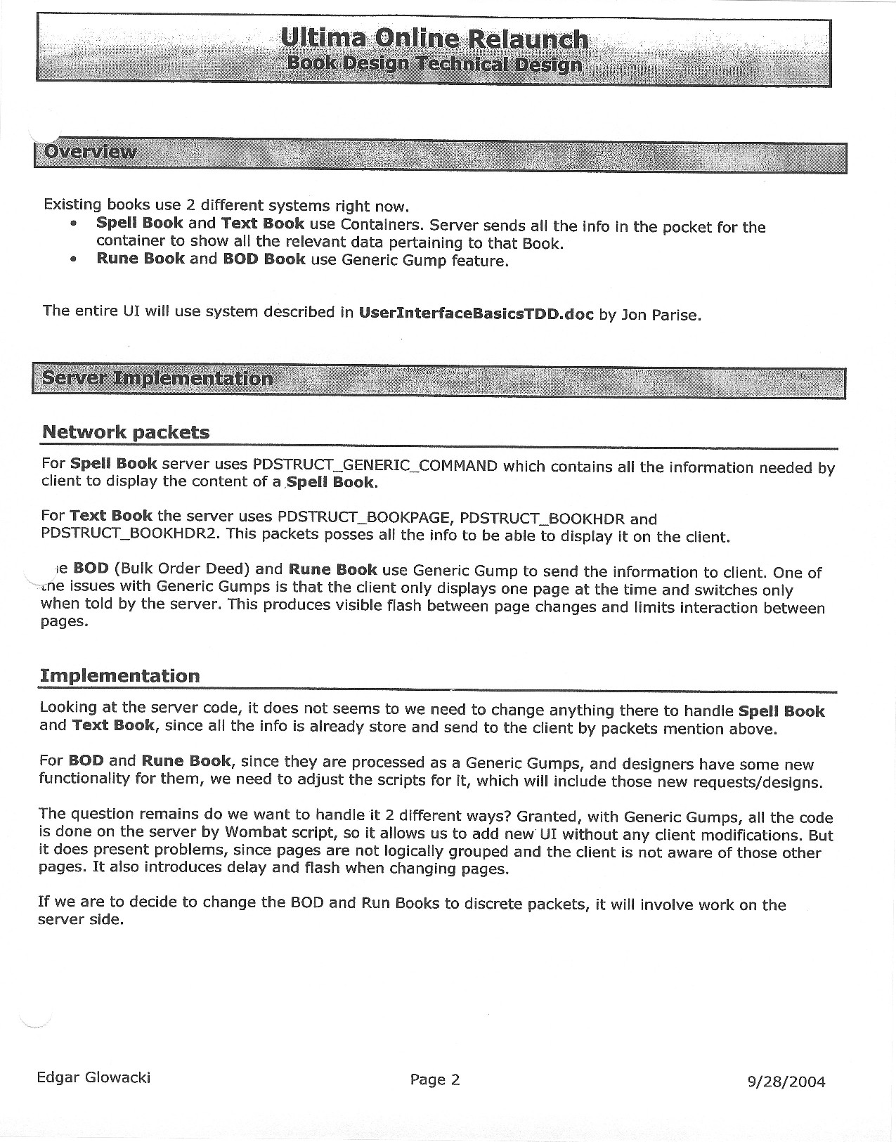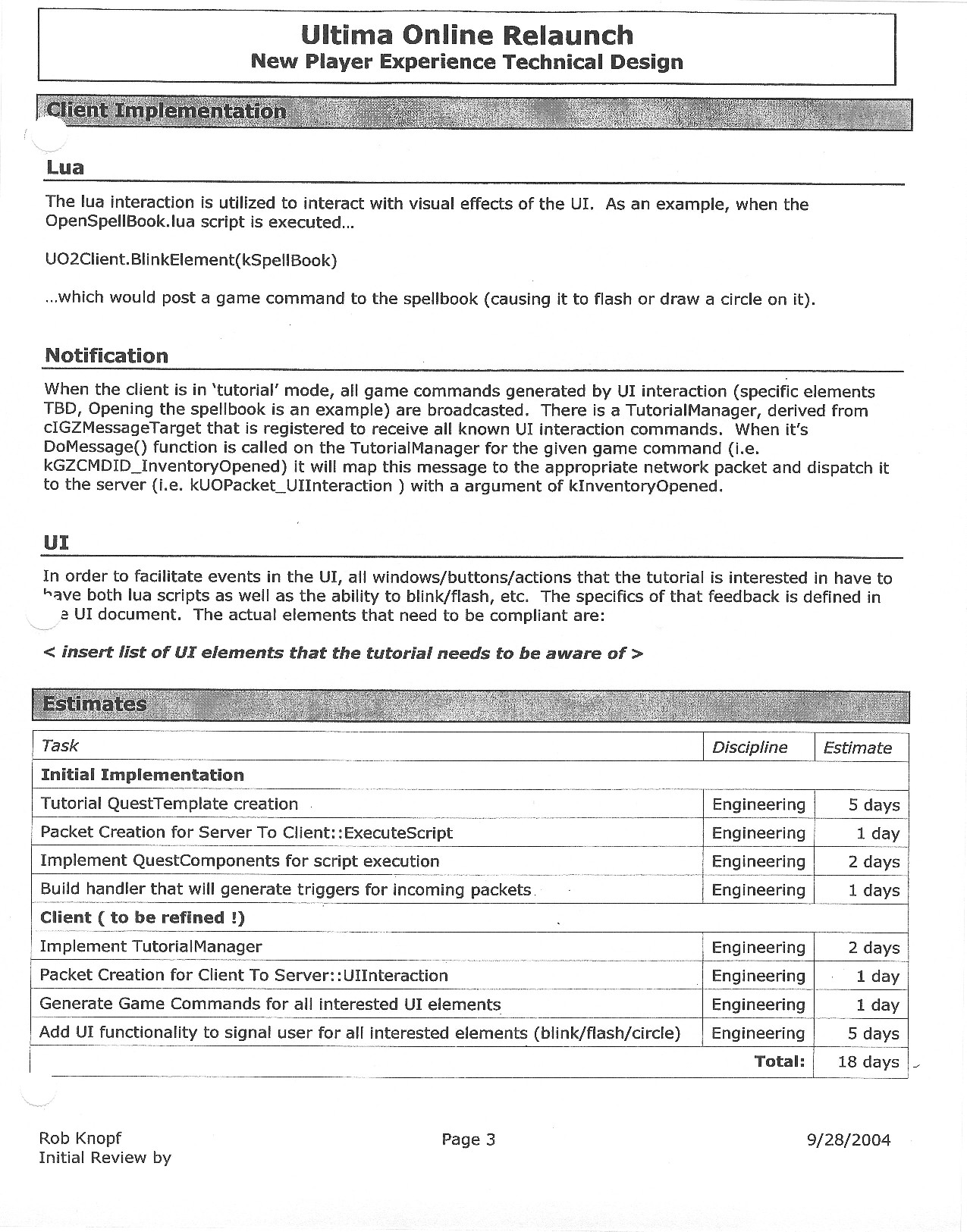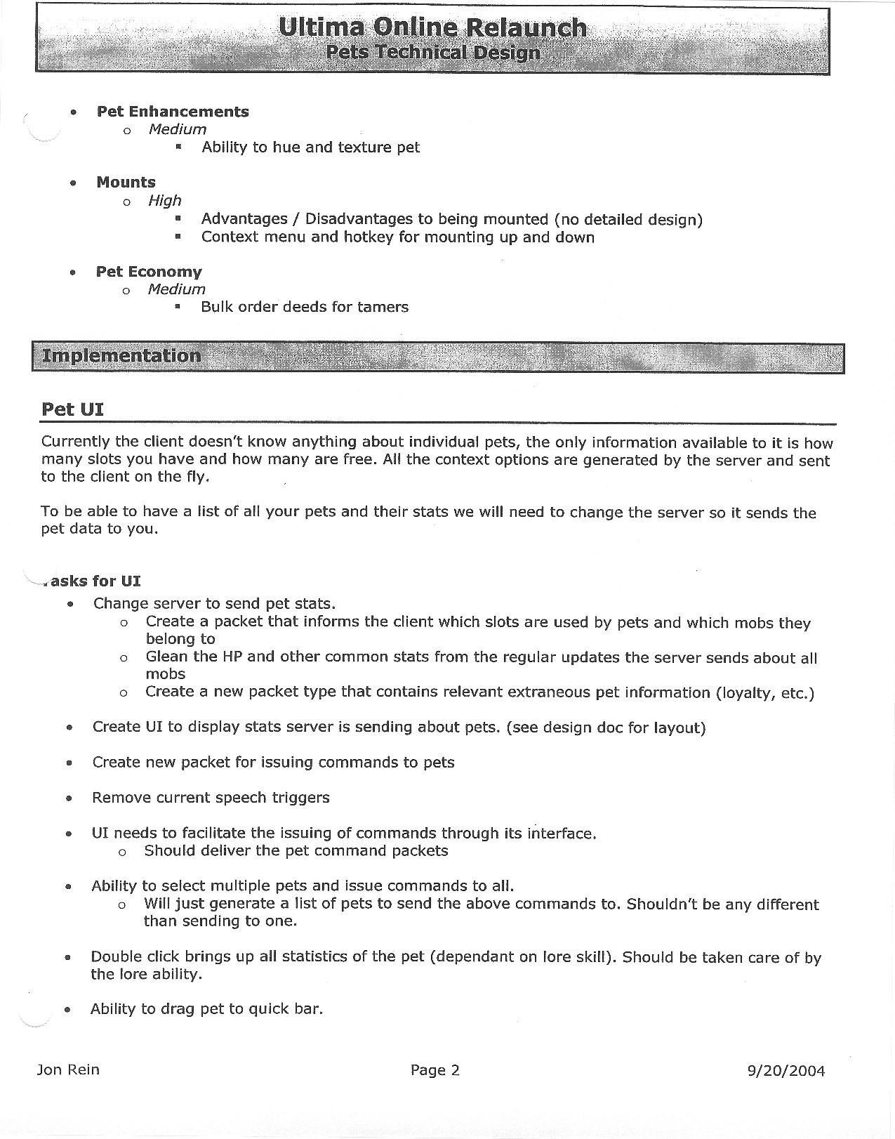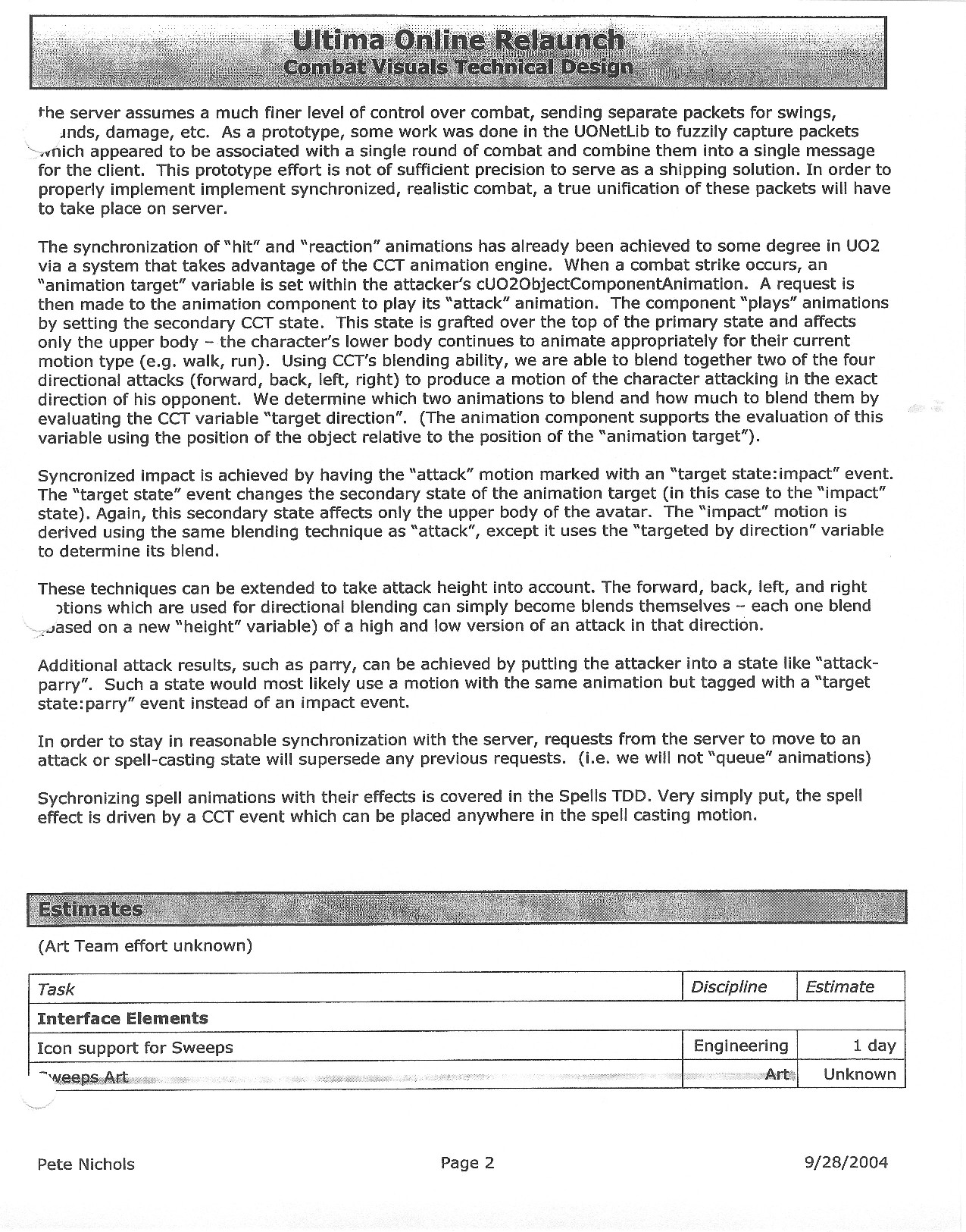 This document is dense, and disucsses almost all the technical details that would have concerned the Ultima Online 2 development team. Early in the document, for example, a comparison of different game engine technologies is performed, and it would appear that Maxis’ GZ engine (which powered The Sims 2, for example) had been chosen as the engine that would power the game. (The Renderware engine was chosen as a backup plan.) Later on in the document, the intentory UI and paperdolling system get discussed.