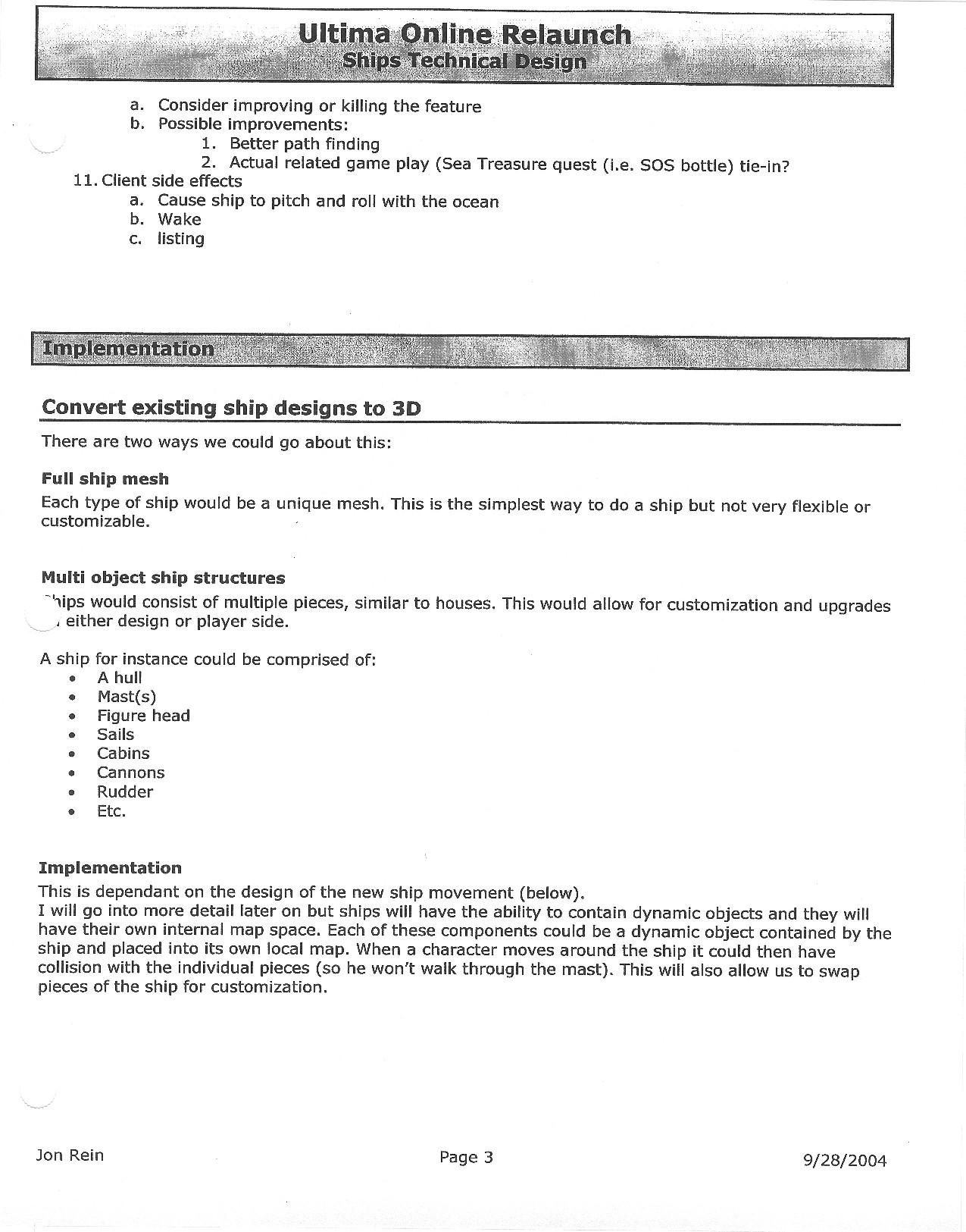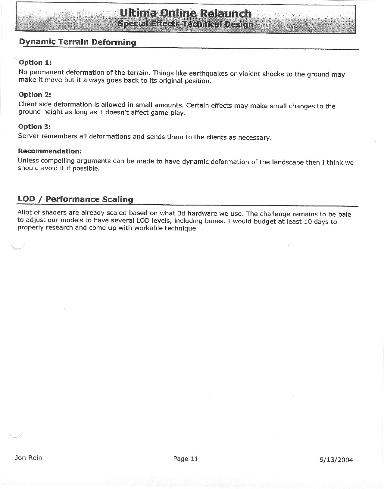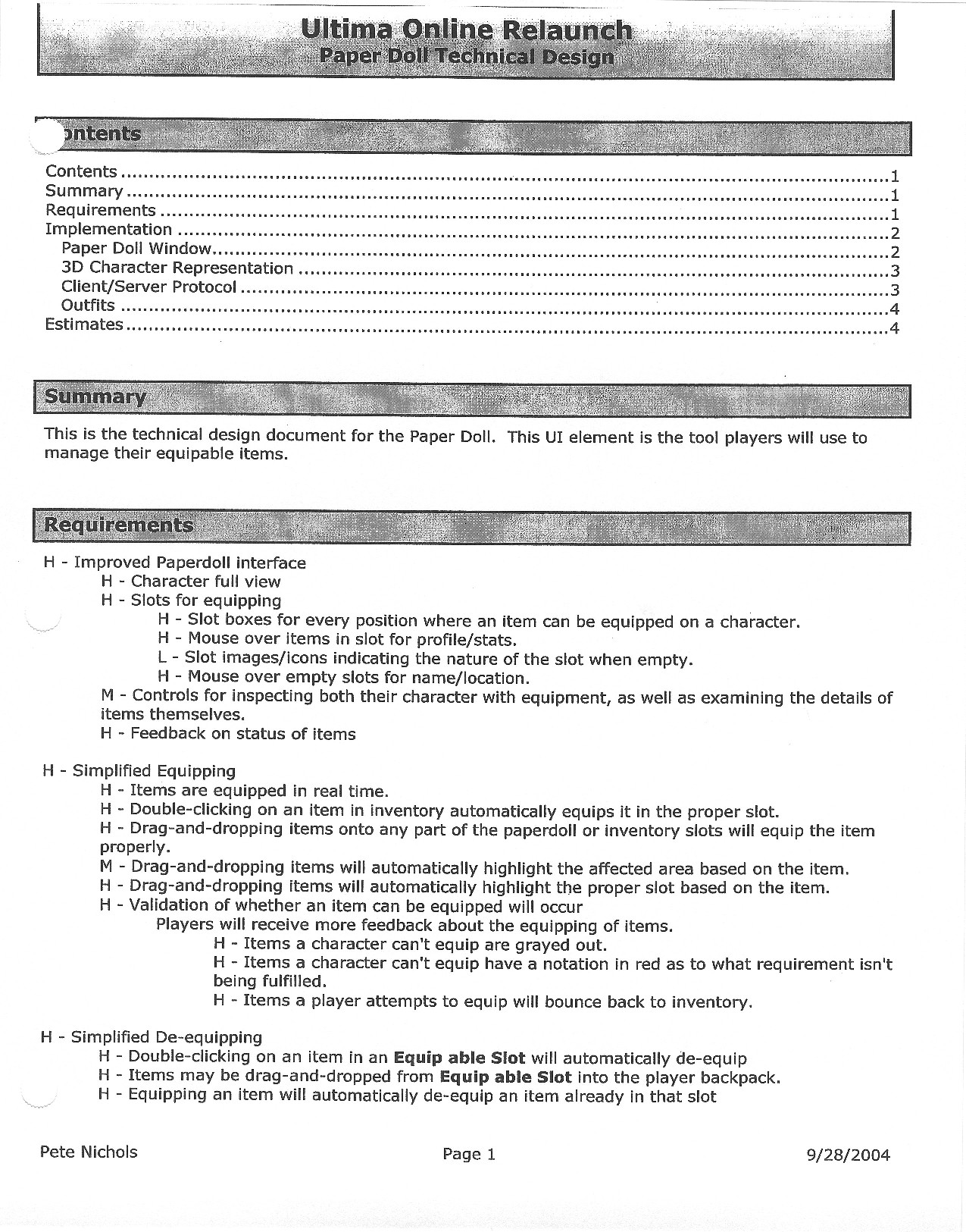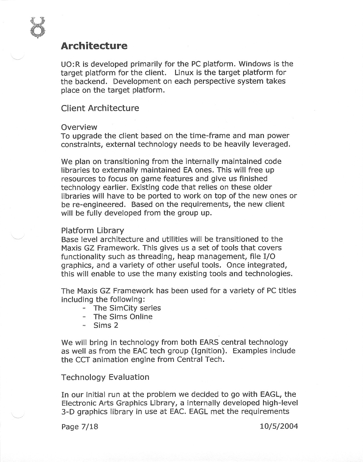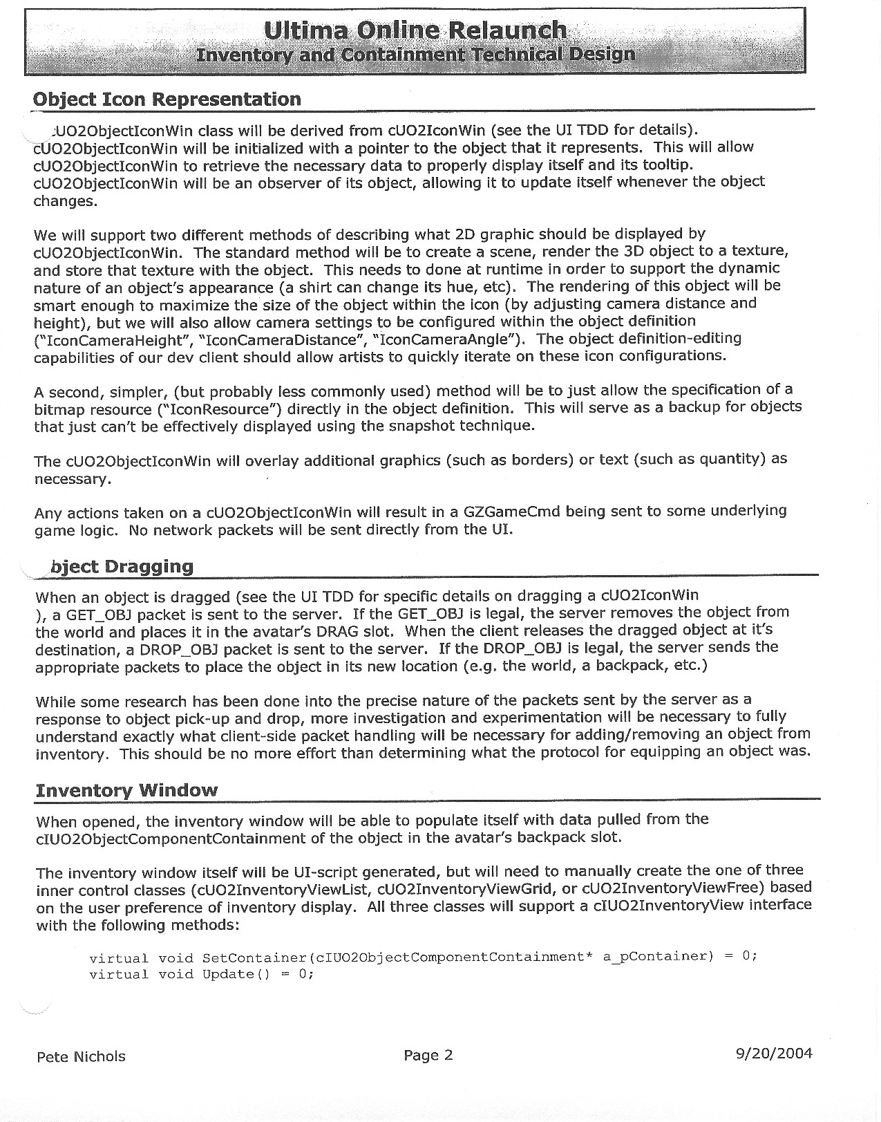 This document is dense, and disucsses almost all the technical details that would have concerned the Ultima Online 2 development team. Early in the document, for example, a comparison of different game engine technologies is performed, and it would appear that Maxis’ GZ engine (which powered The Sims 2, for example) had been chosen as the engine that would power the game. (The Renderware engine was chosen as a backup plan.) Later on in the document, the intentory UI and paperdolling system get discussed.