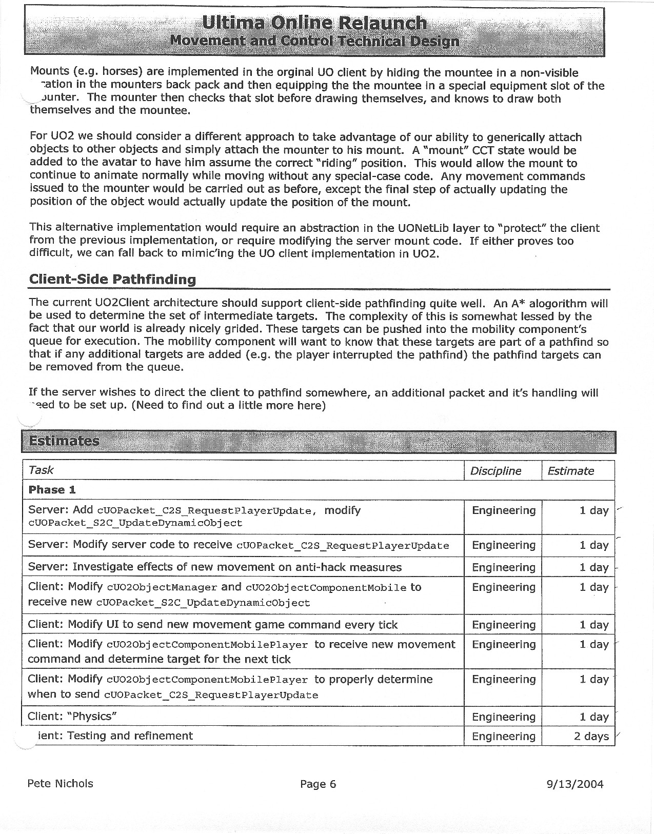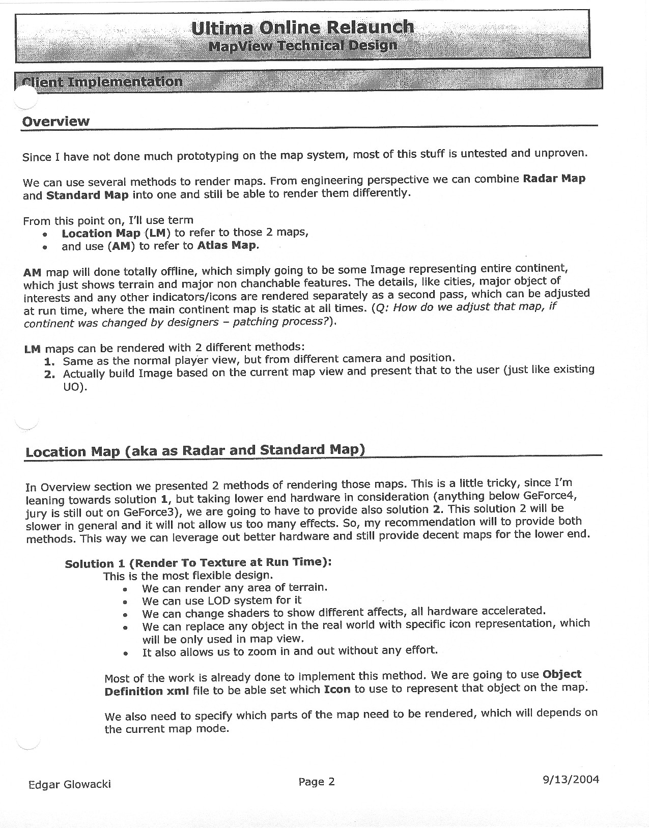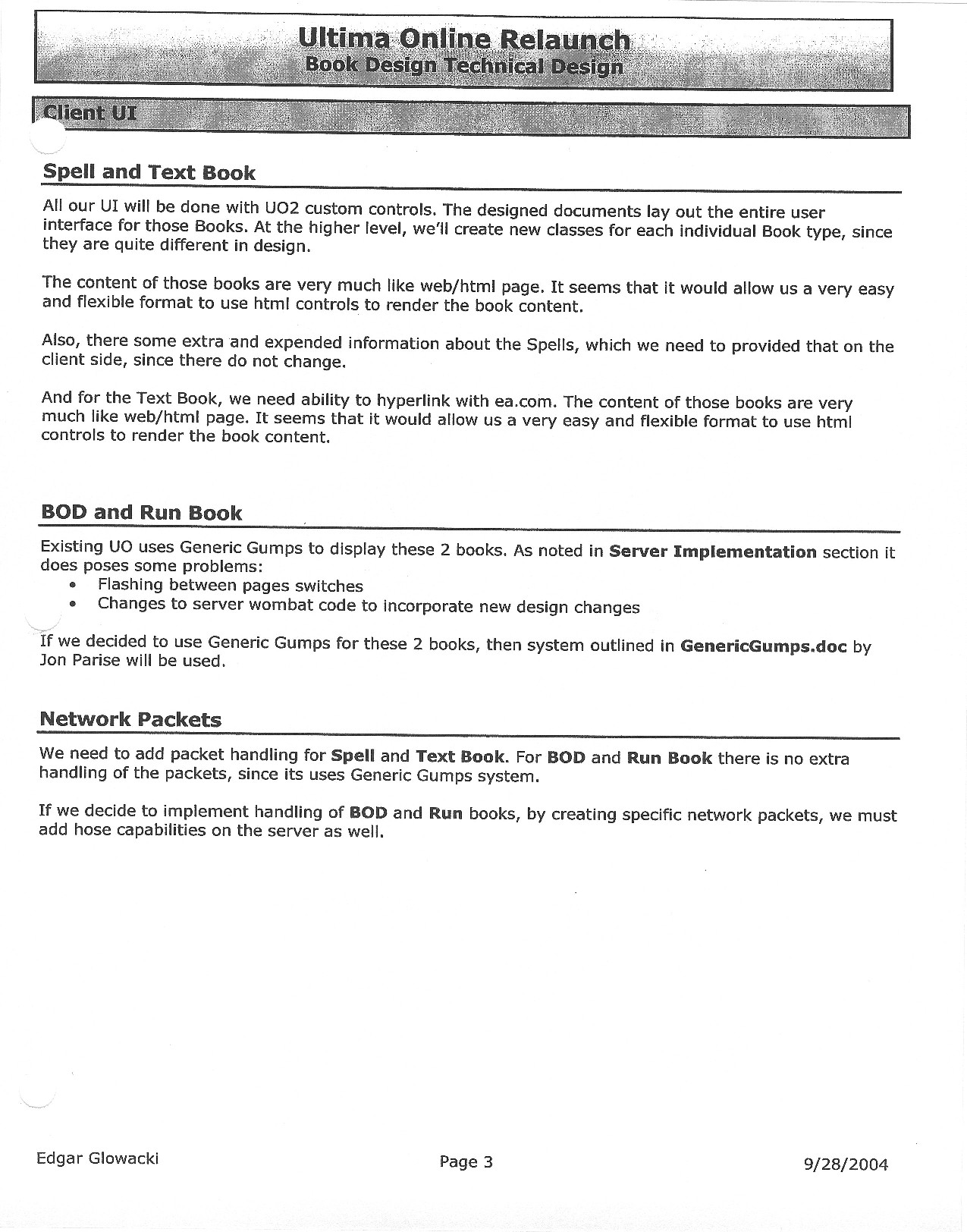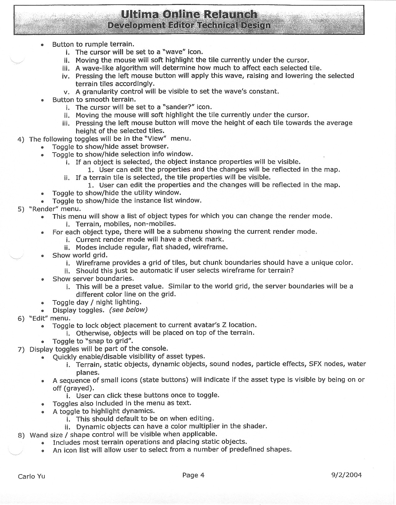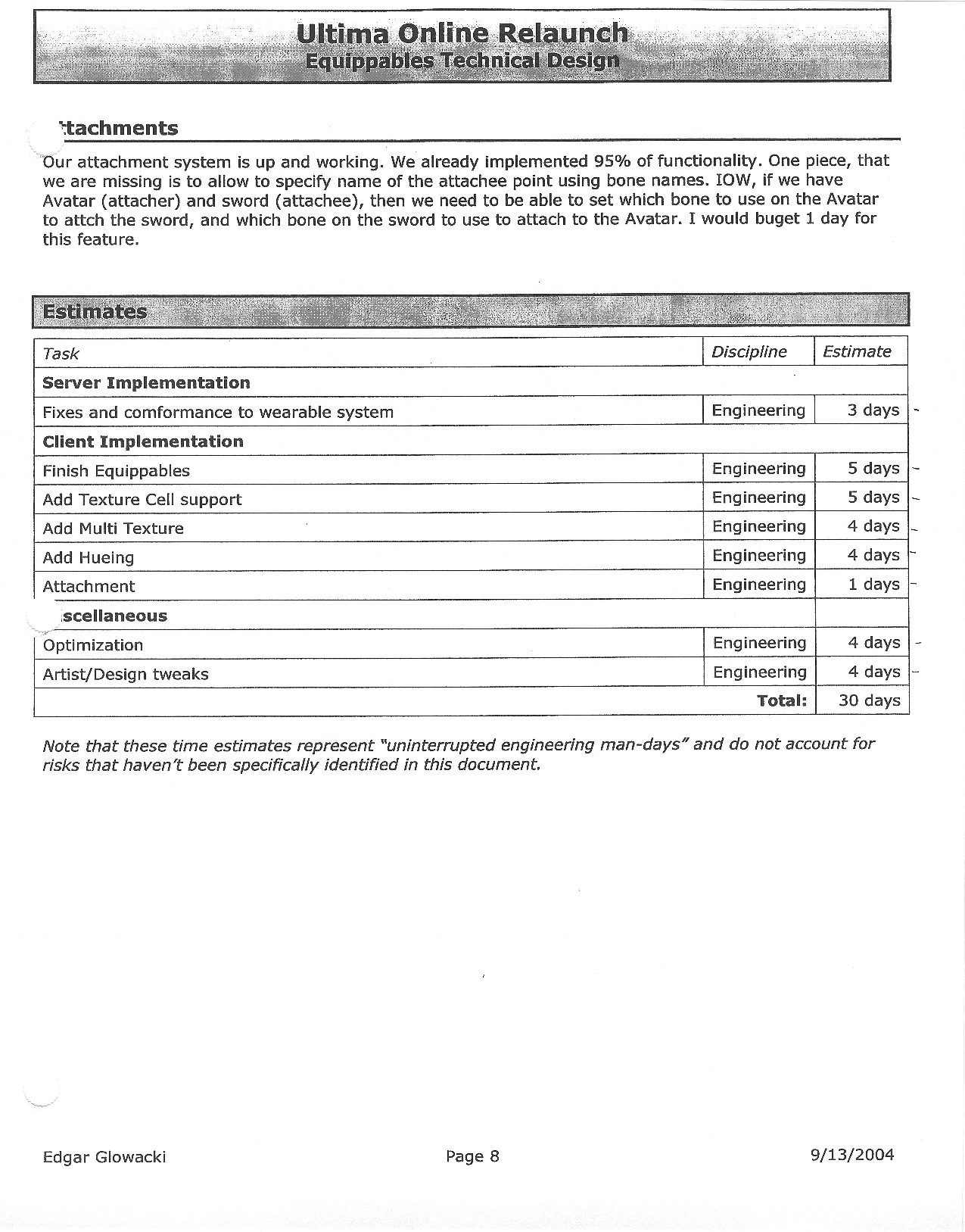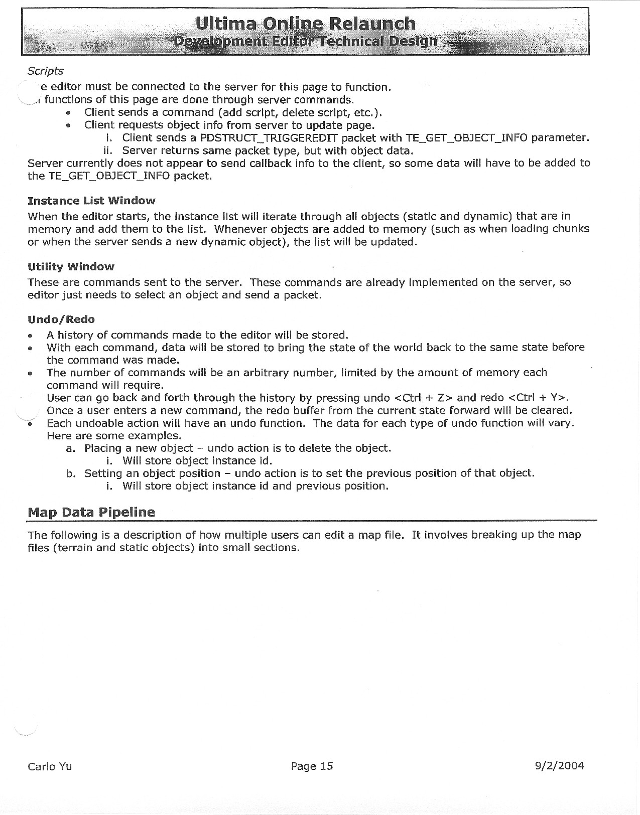 This document is dense, and disucsses almost all the technical details that would have concerned the Ultima Online 2 development team. Early in the document, for example, a comparison of different game engine technologies is performed, and it would appear that Maxis’ GZ engine (which powered The Sims 2, for example) had been chosen as the engine that would power the game. (The Renderware engine was chosen as a backup plan.) Later on in the document, the intentory UI and paperdolling system get discussed.
