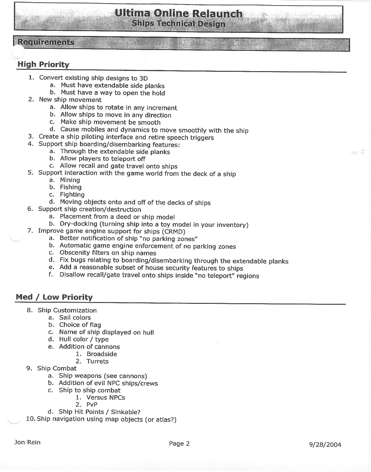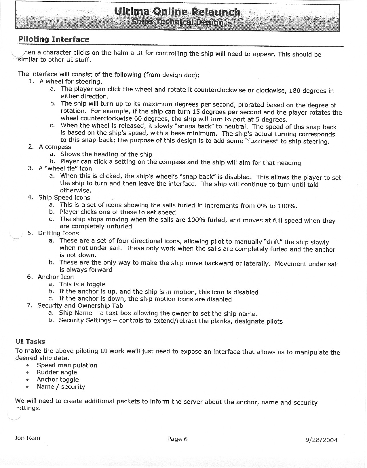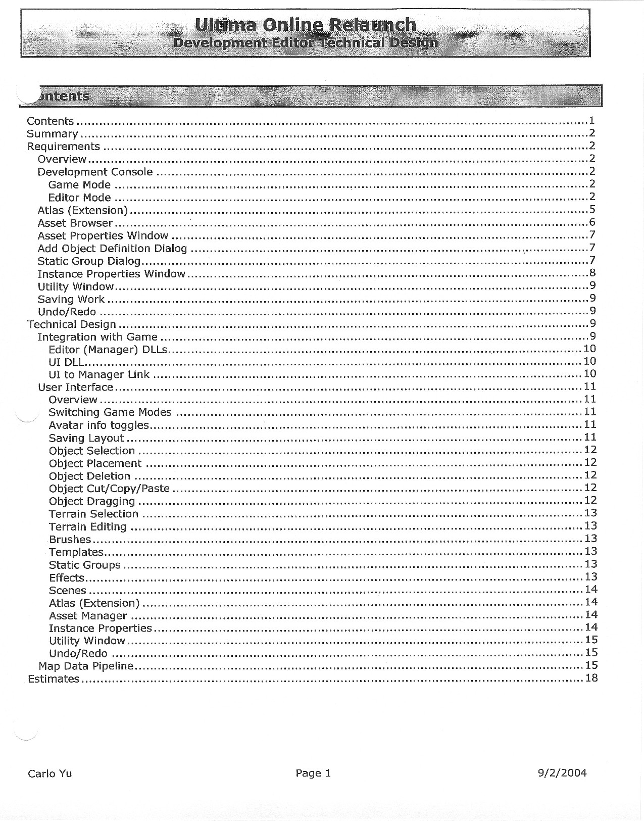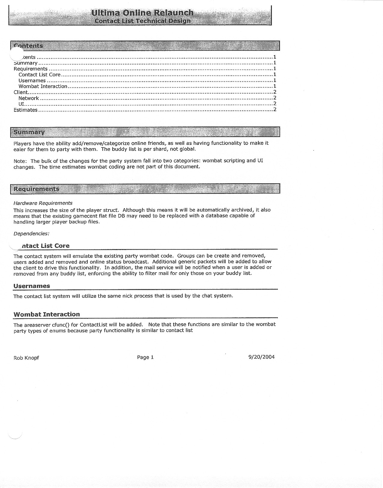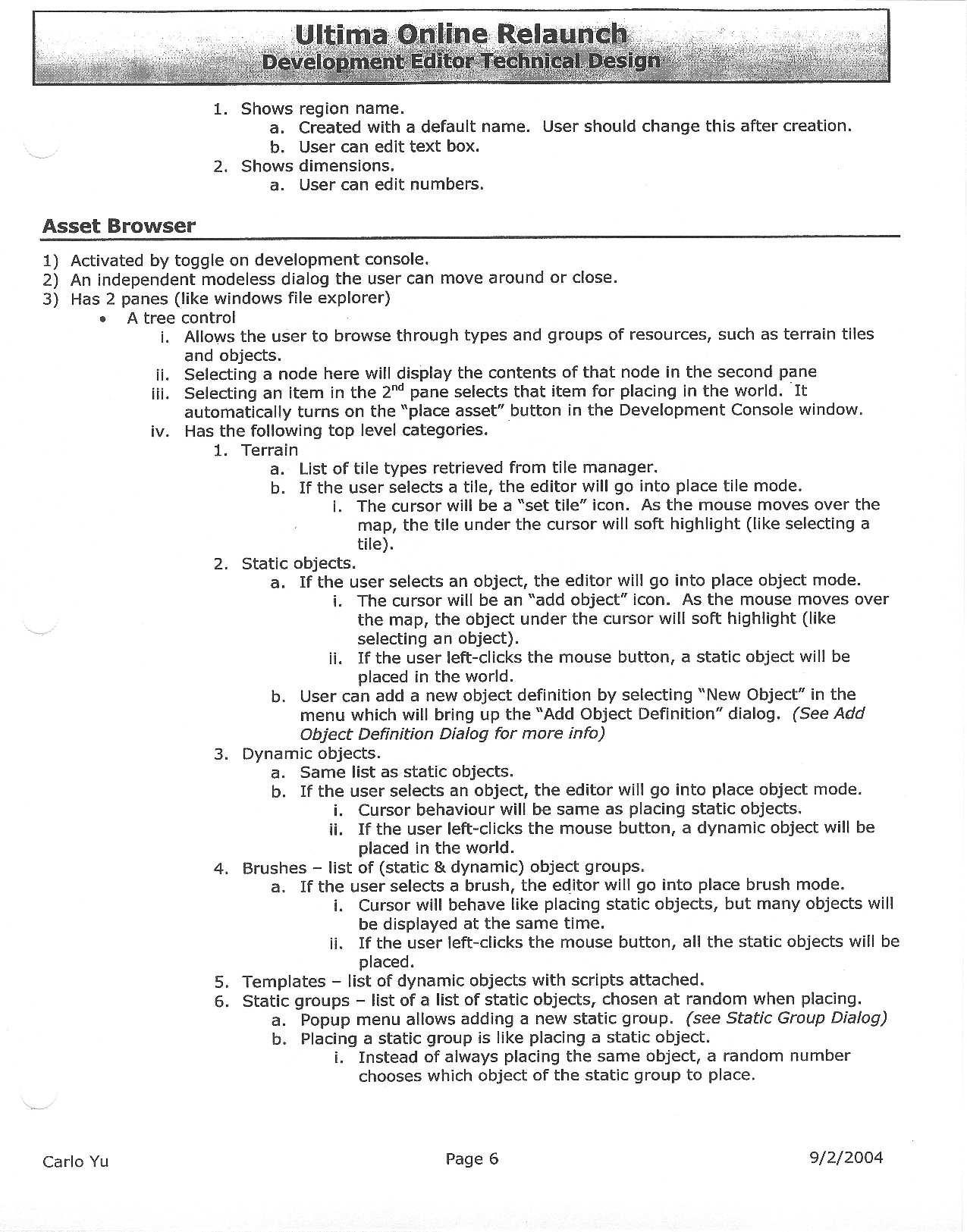 This document is dense, and disucsses almost all the technical details that would have concerned the Ultima Online 2 development team. Early in the document, for example, a comparison of different game engine technologies is performed, and it would appear that Maxis’ GZ engine (which powered The Sims 2, for example) had been chosen as the engine that would power the game. (The Renderware engine was chosen as a backup plan.) Later on in the document, the intentory UI and paperdolling system get discussed.