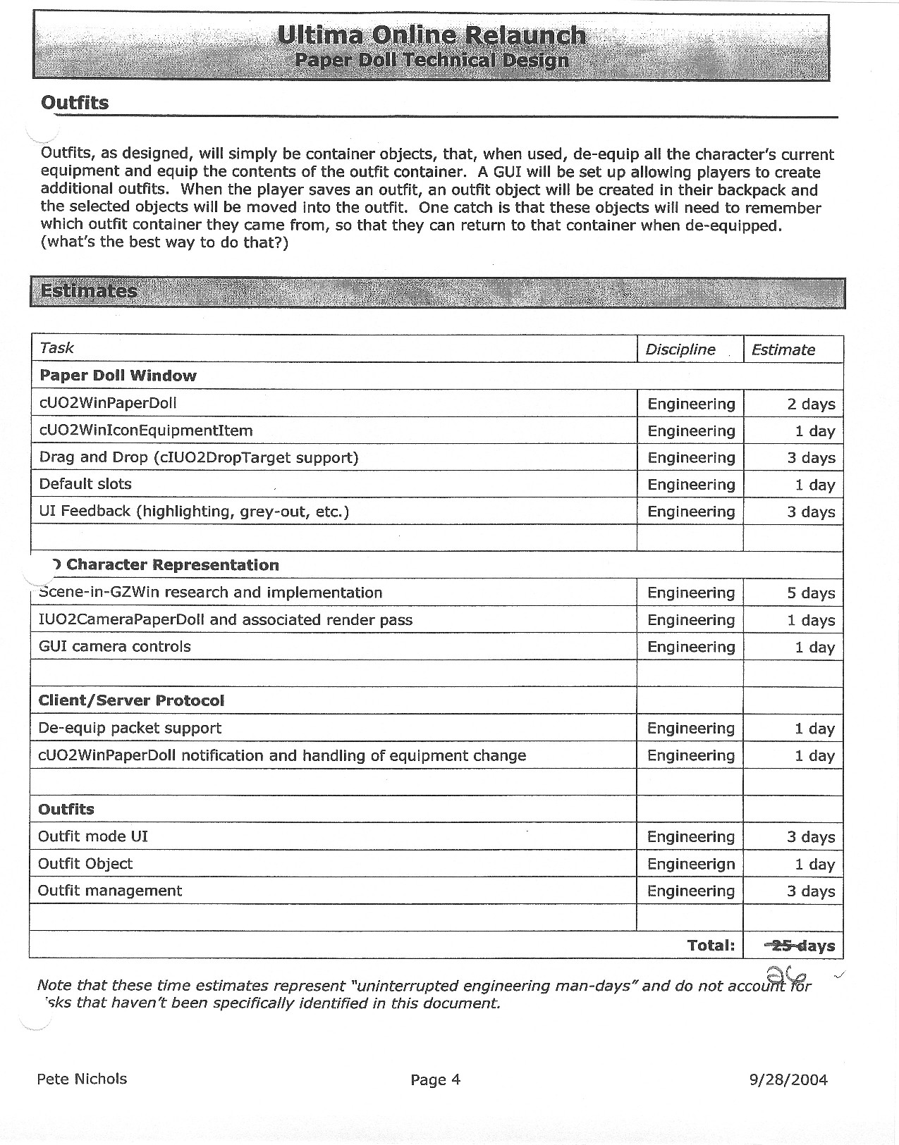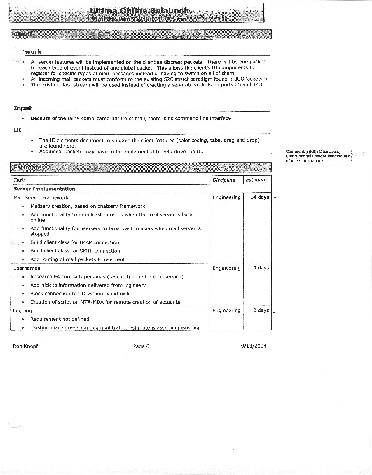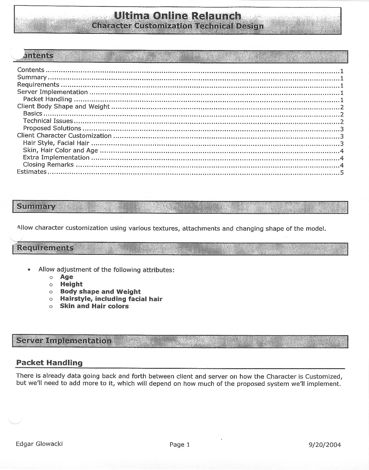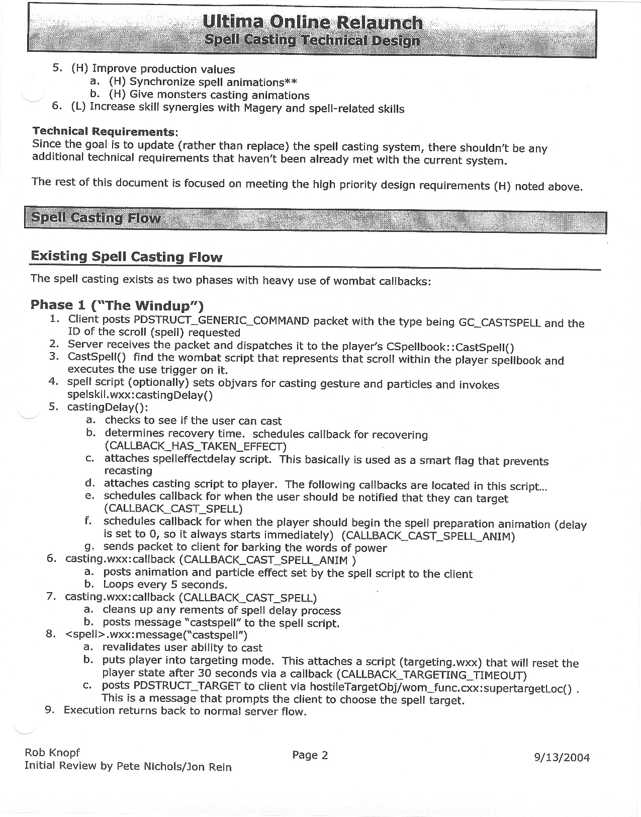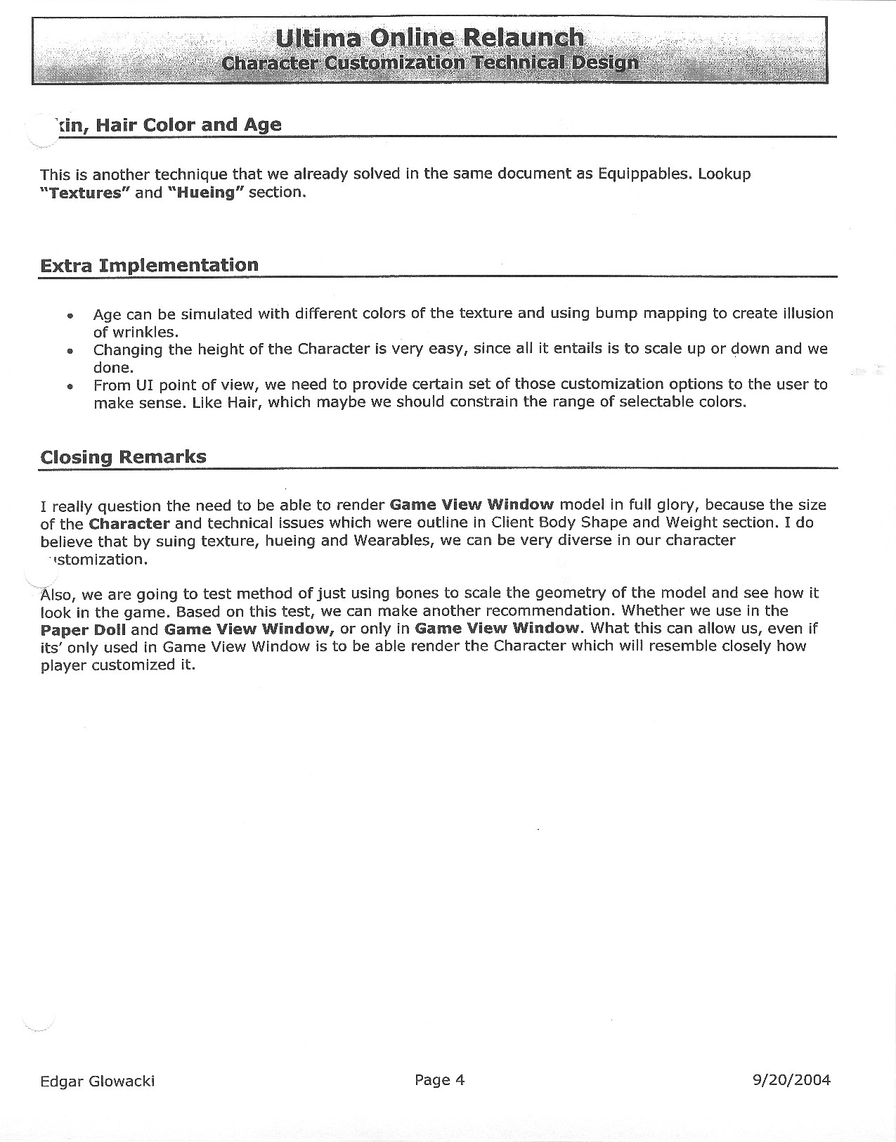 This document is dense, and disucsses almost all the technical details that would have concerned the Ultima Online 2 development team. Early in the document, for example, a comparison of different game engine technologies is performed, and it would appear that Maxis’ GZ engine (which powered The Sims 2, for example) had been chosen as the engine that would power the game. (The Renderware engine was chosen as a backup plan.) Later on in the document, the intentory UI and paperdolling system get discussed.
