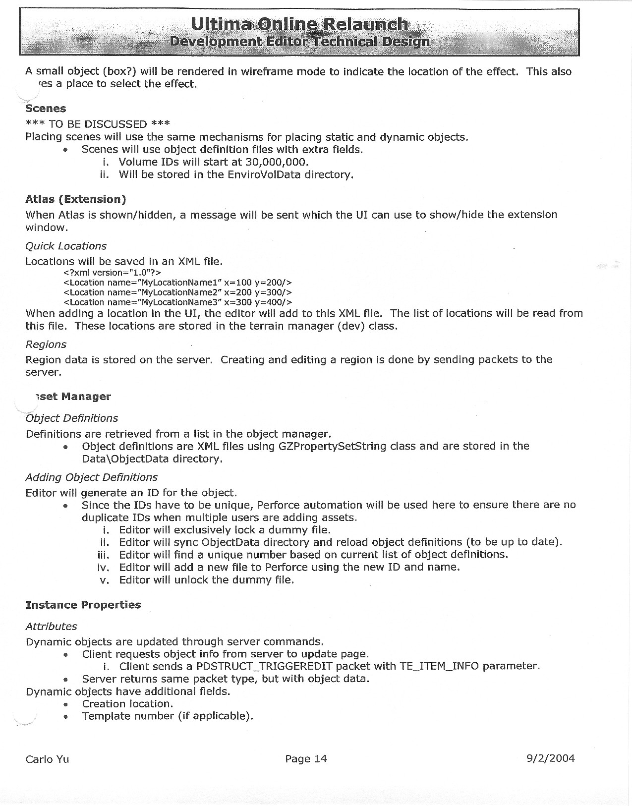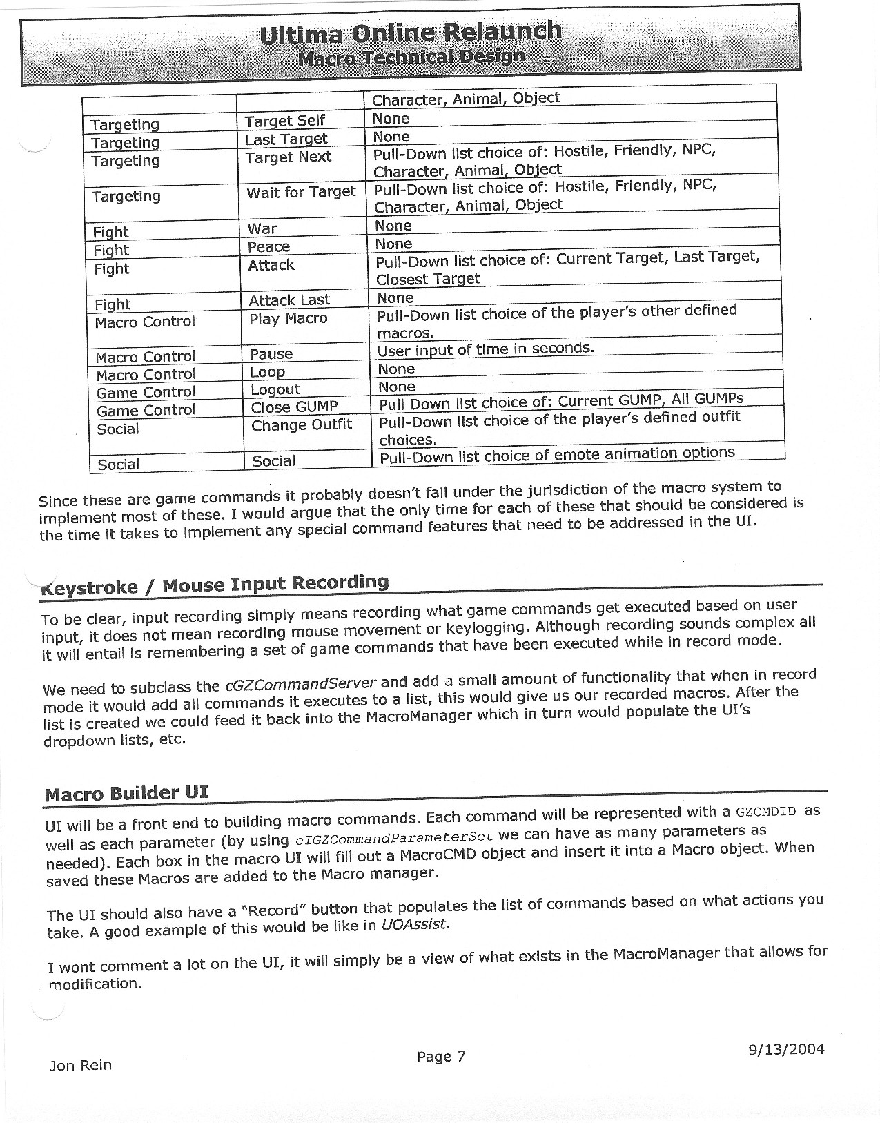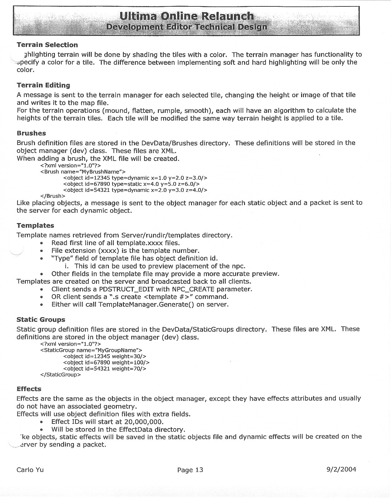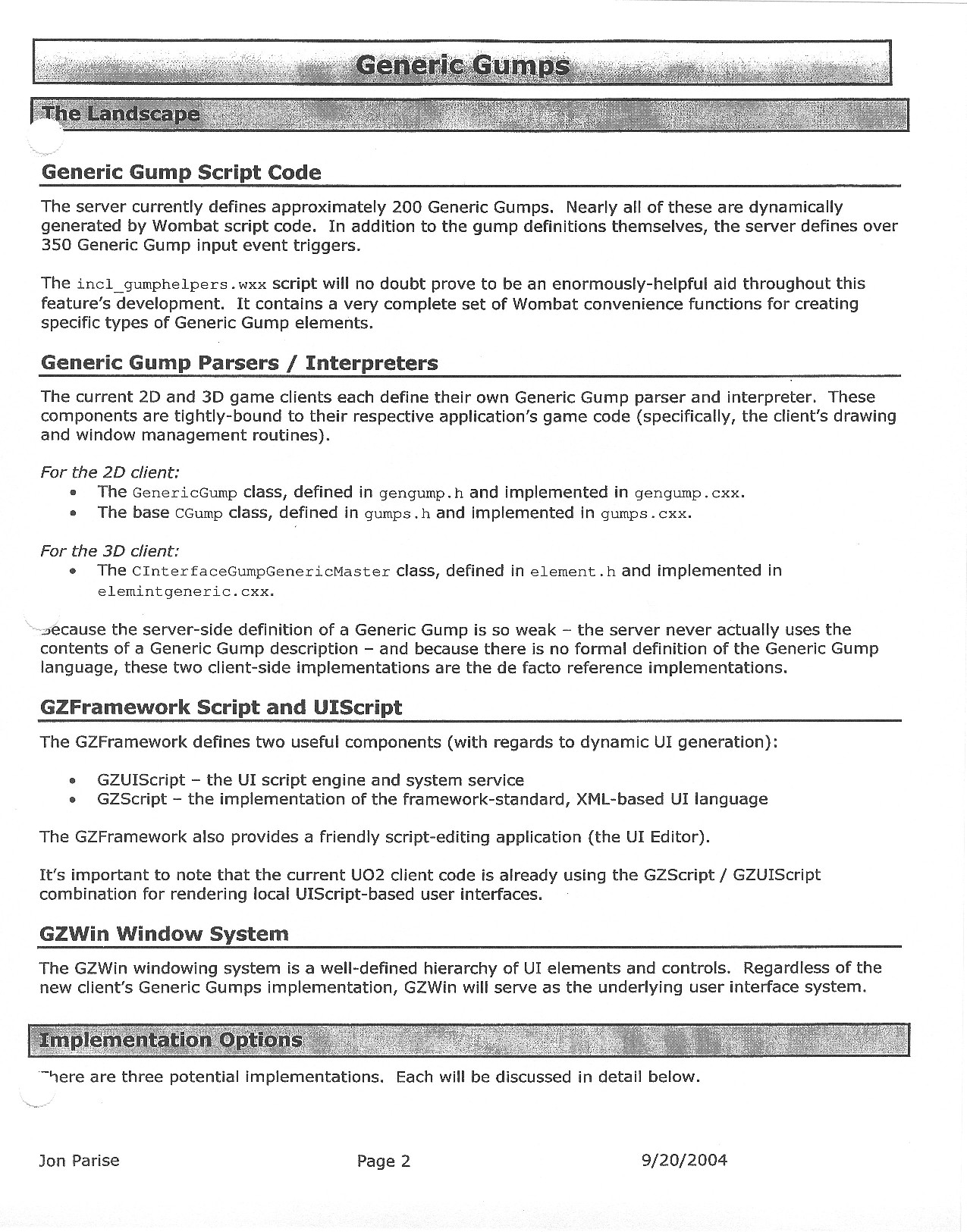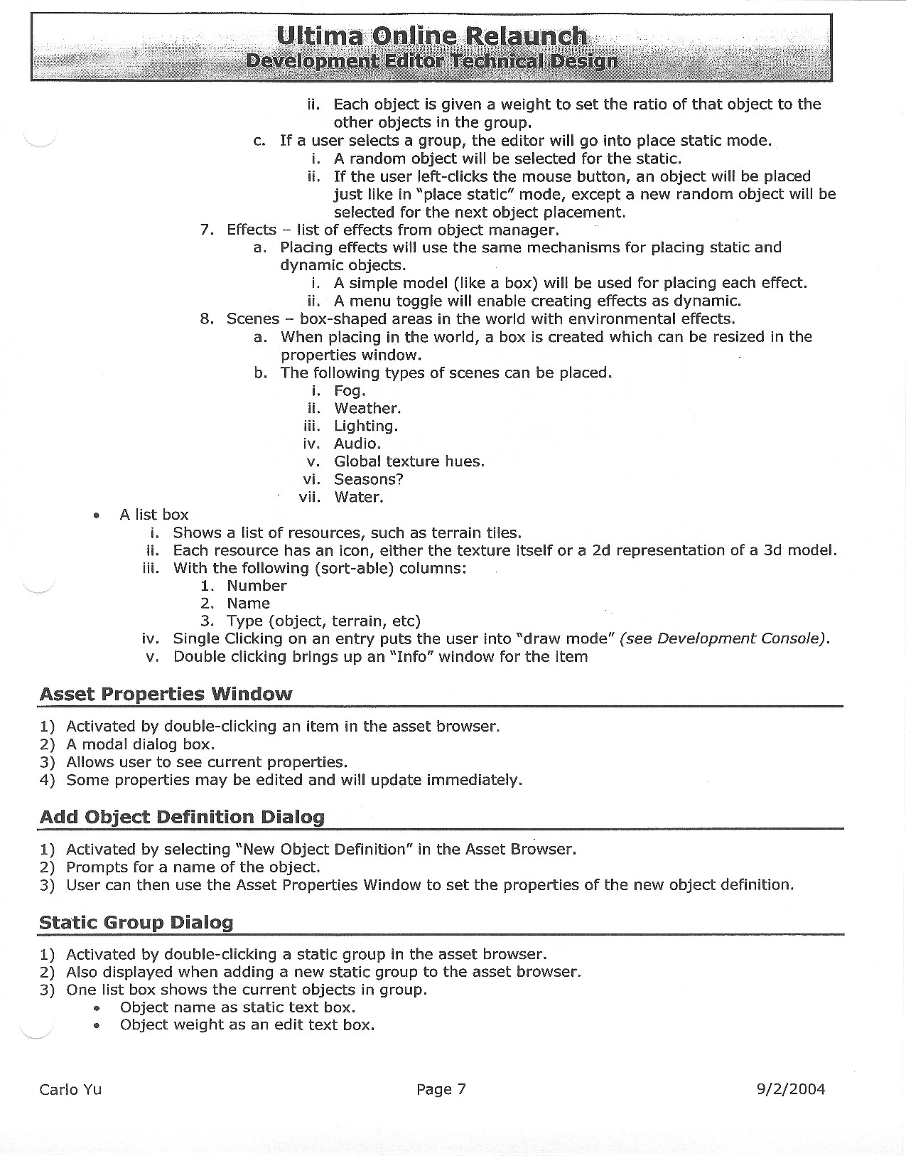 This document is dense, and disucsses almost all the technical details that would have concerned the Ultima Online 2 development team. Early in the document, for example, a comparison of different game engine technologies is performed, and it would appear that Maxis’ GZ engine (which powered The Sims 2, for example) had been chosen as the engine that would power the game. (The Renderware engine was chosen as a backup plan.) Later on in the document, the intentory UI and paperdolling system get discussed.