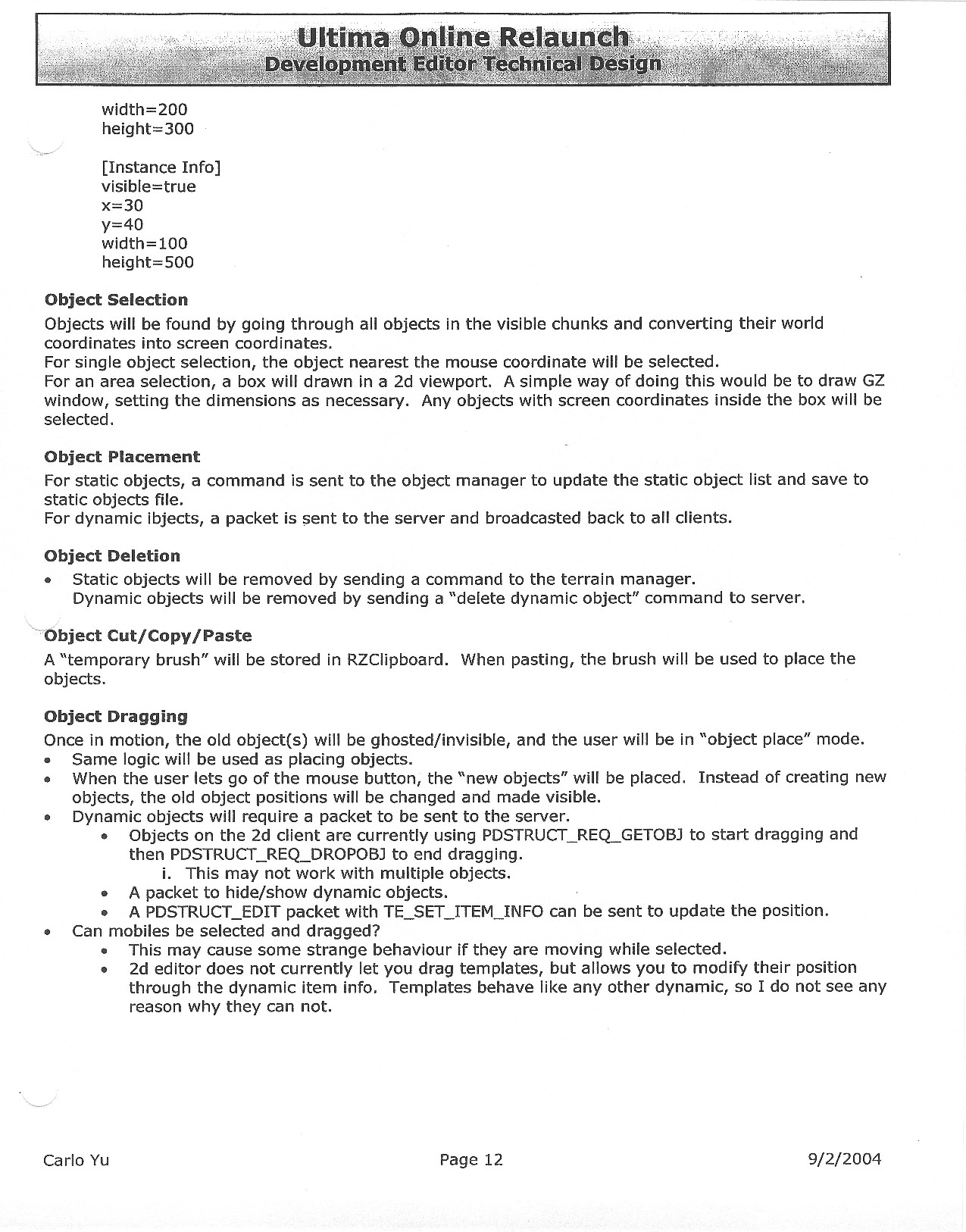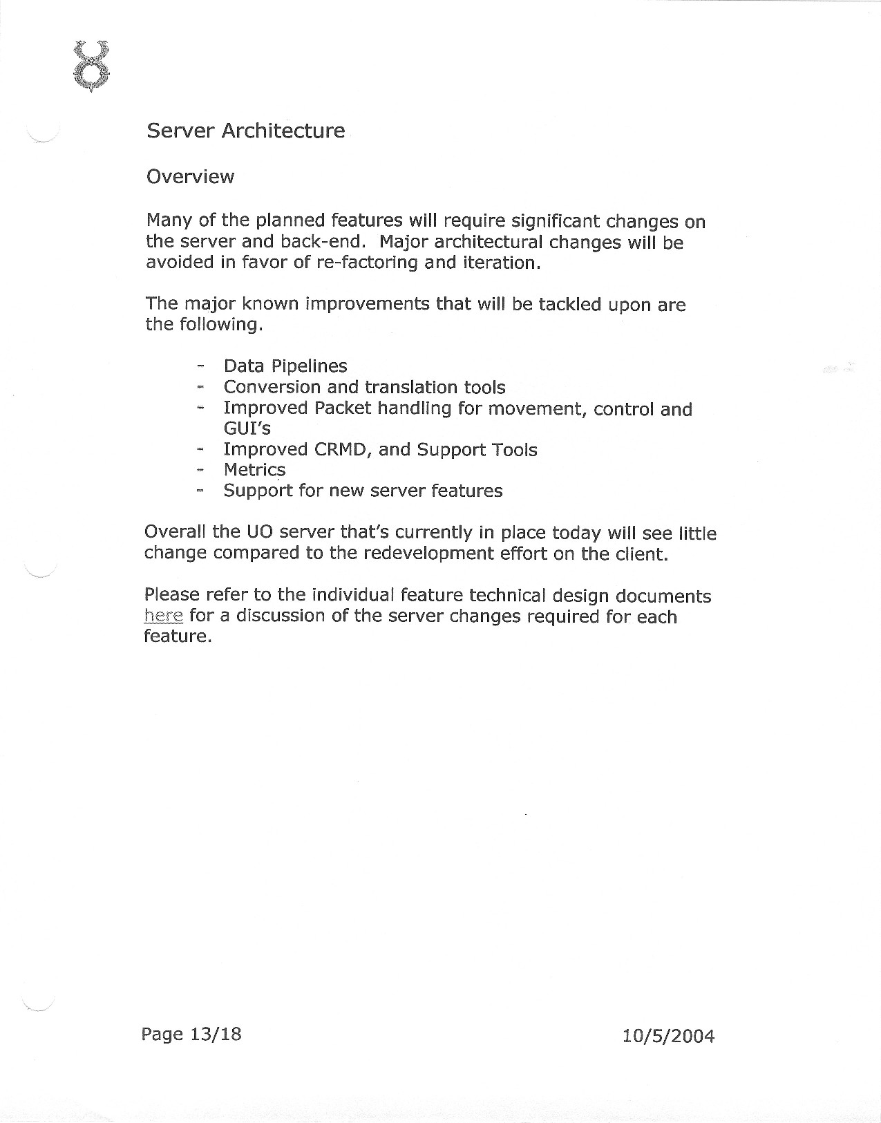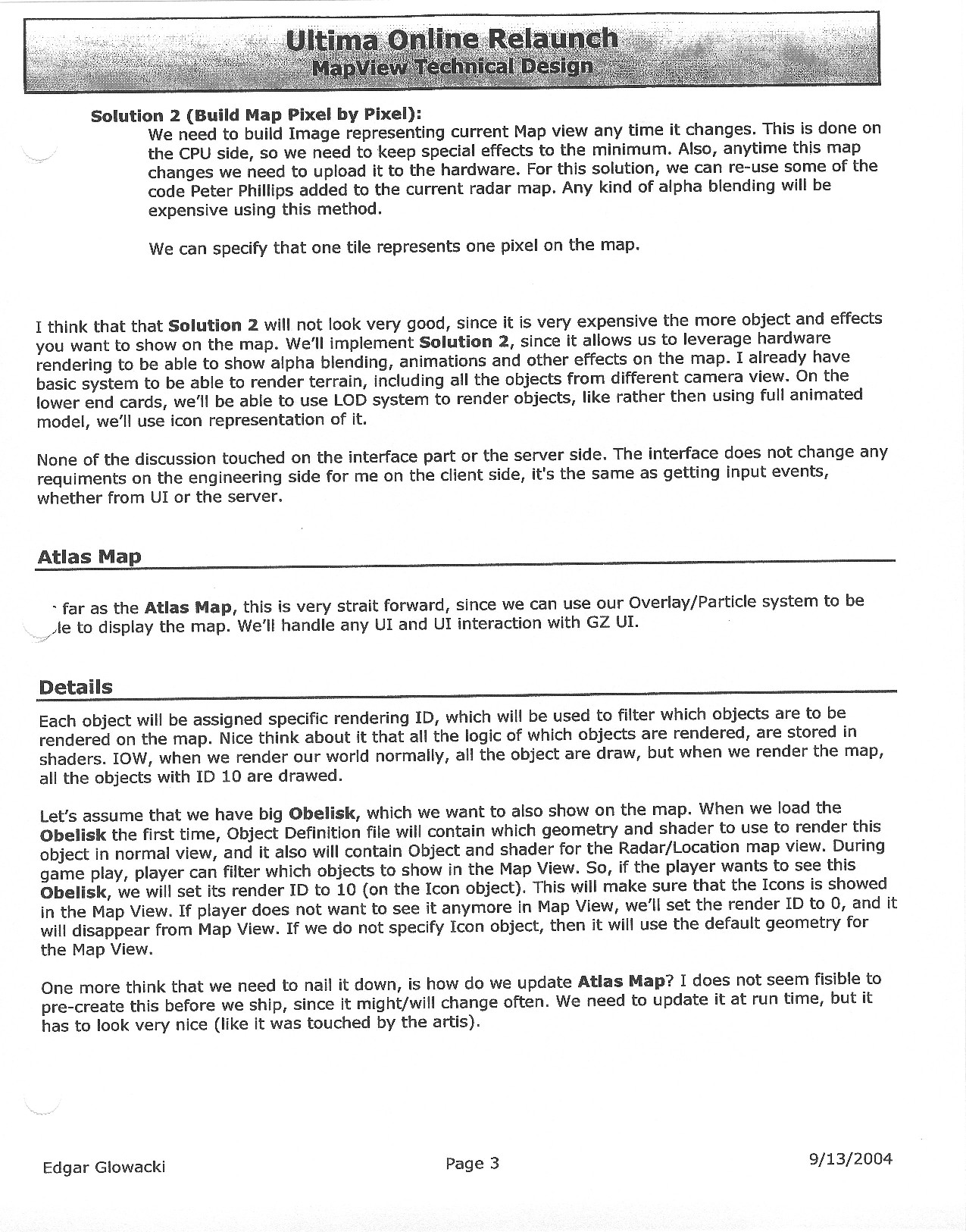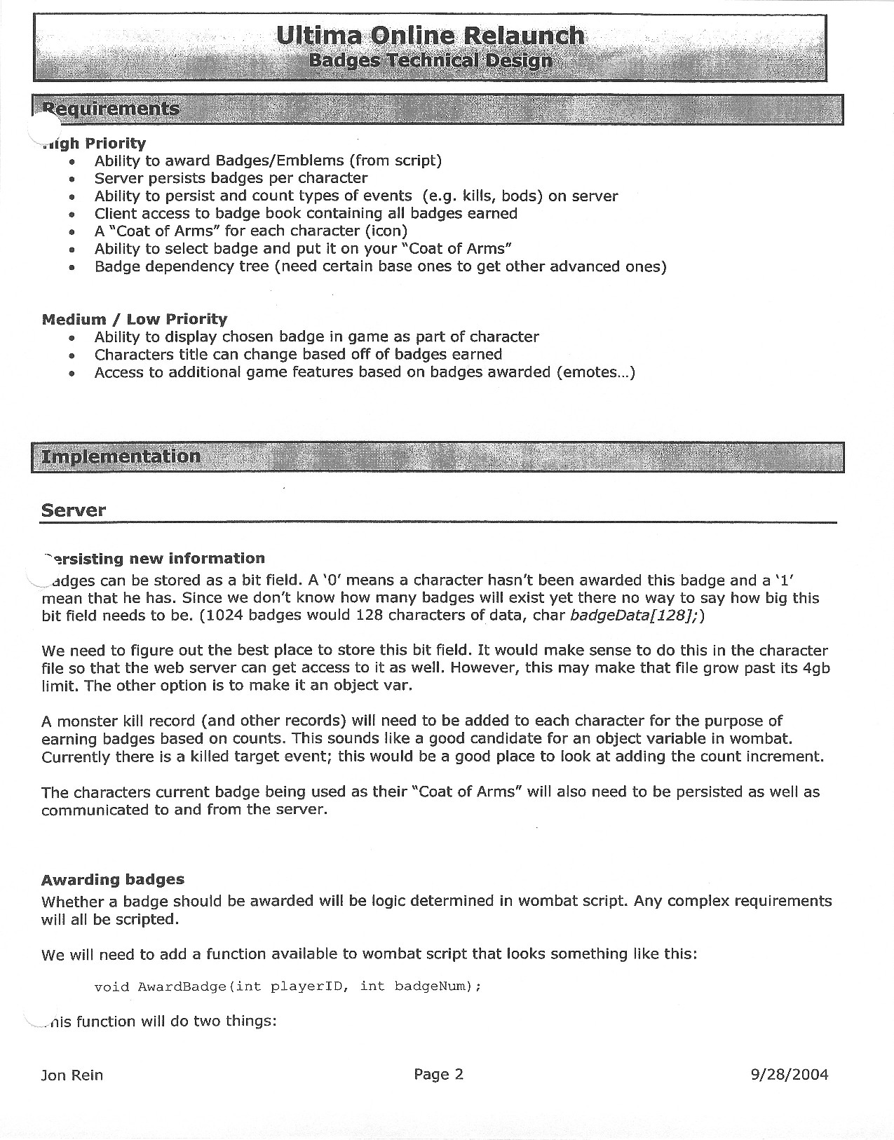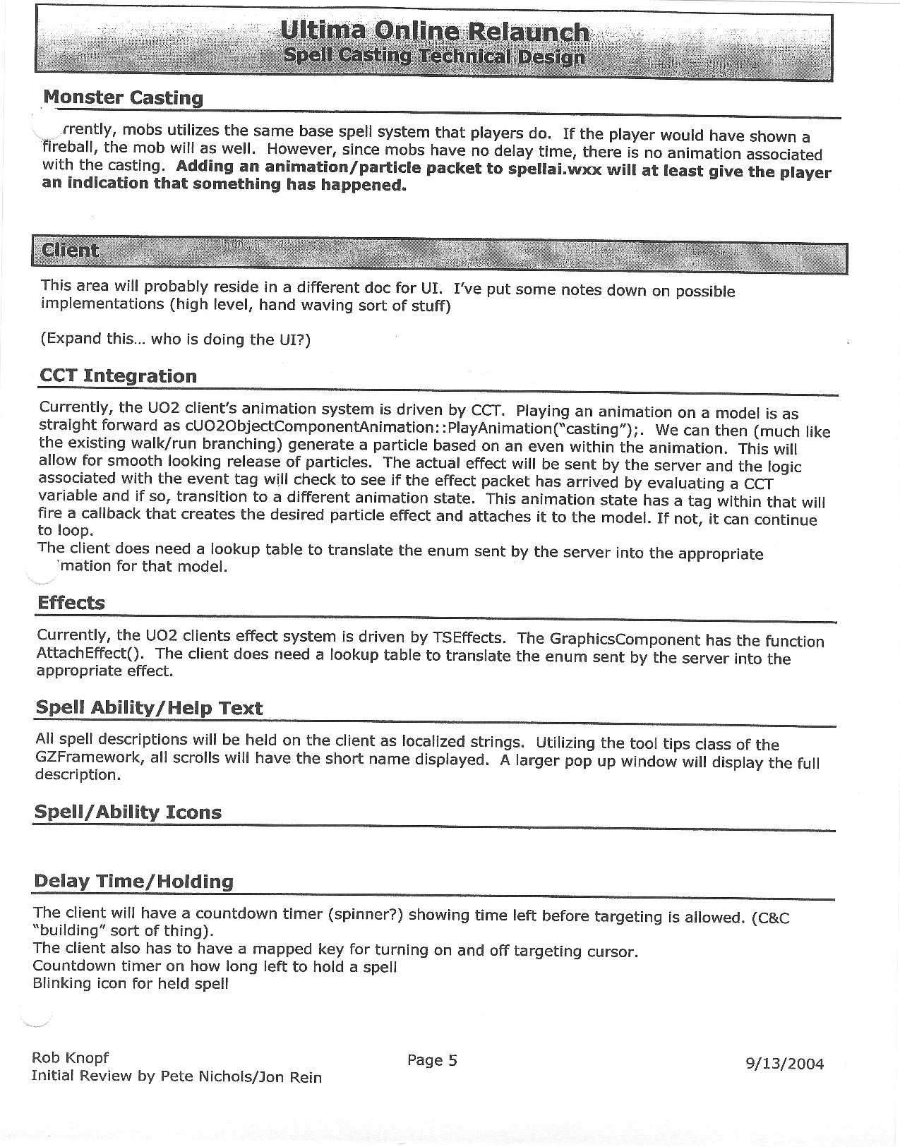 This document is dense, and disucsses almost all the technical details that would have concerned the Ultima Online 2 development team. Early in the document, for example, a comparison of different game engine technologies is performed, and it would appear that Maxis’ GZ engine (which powered The Sims 2, for example) had been chosen as the engine that would power the game. (The Renderware engine was chosen as a backup plan.) Later on in the document, the intentory UI and paperdolling system get discussed.