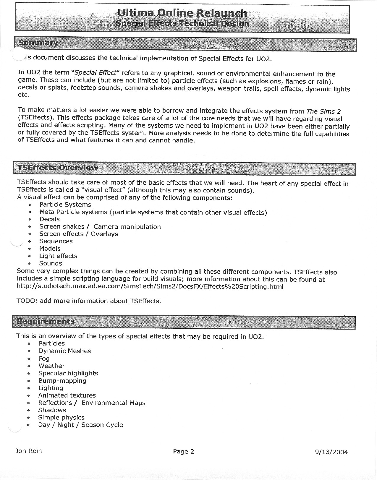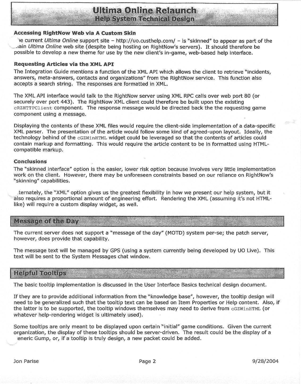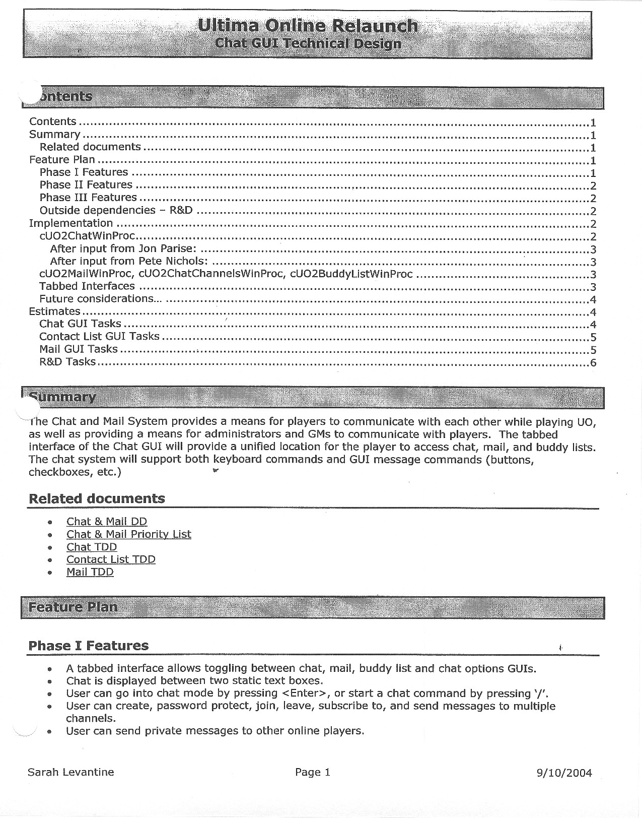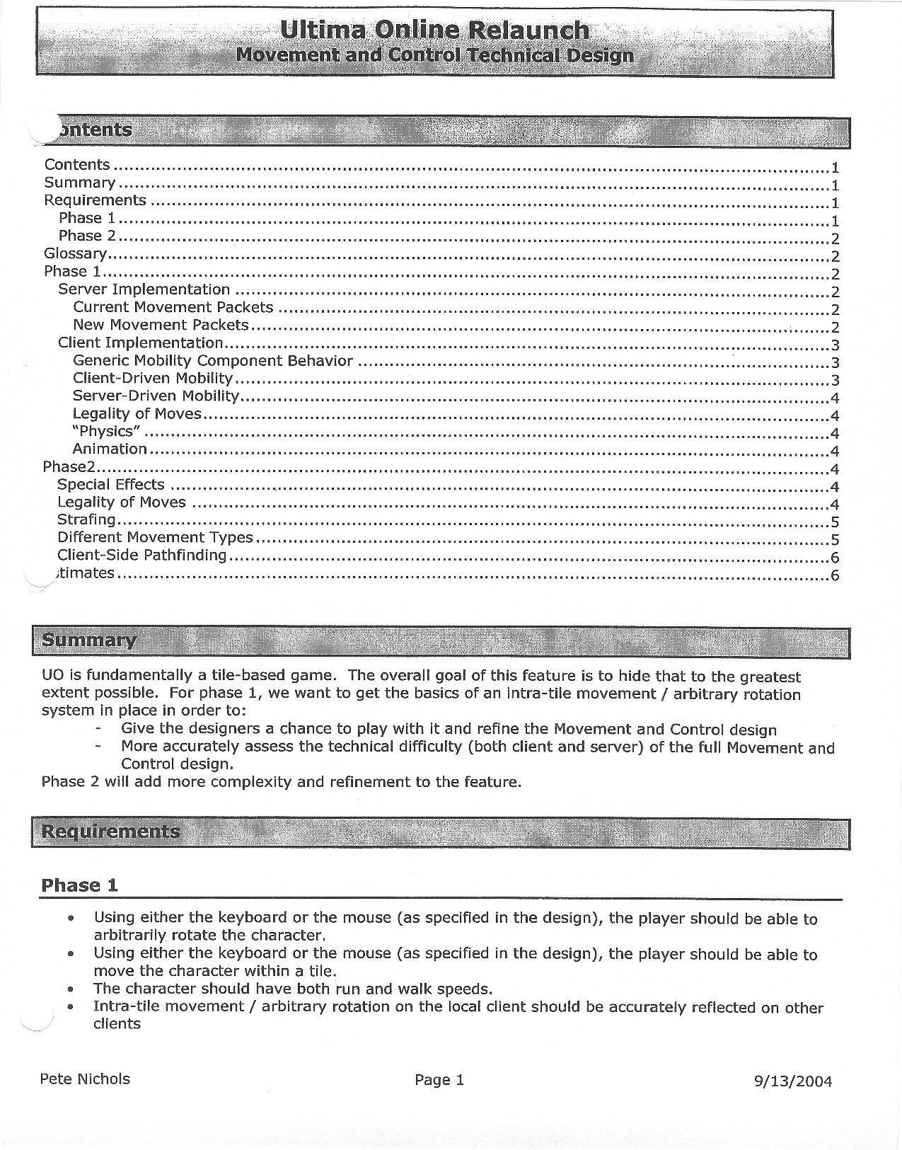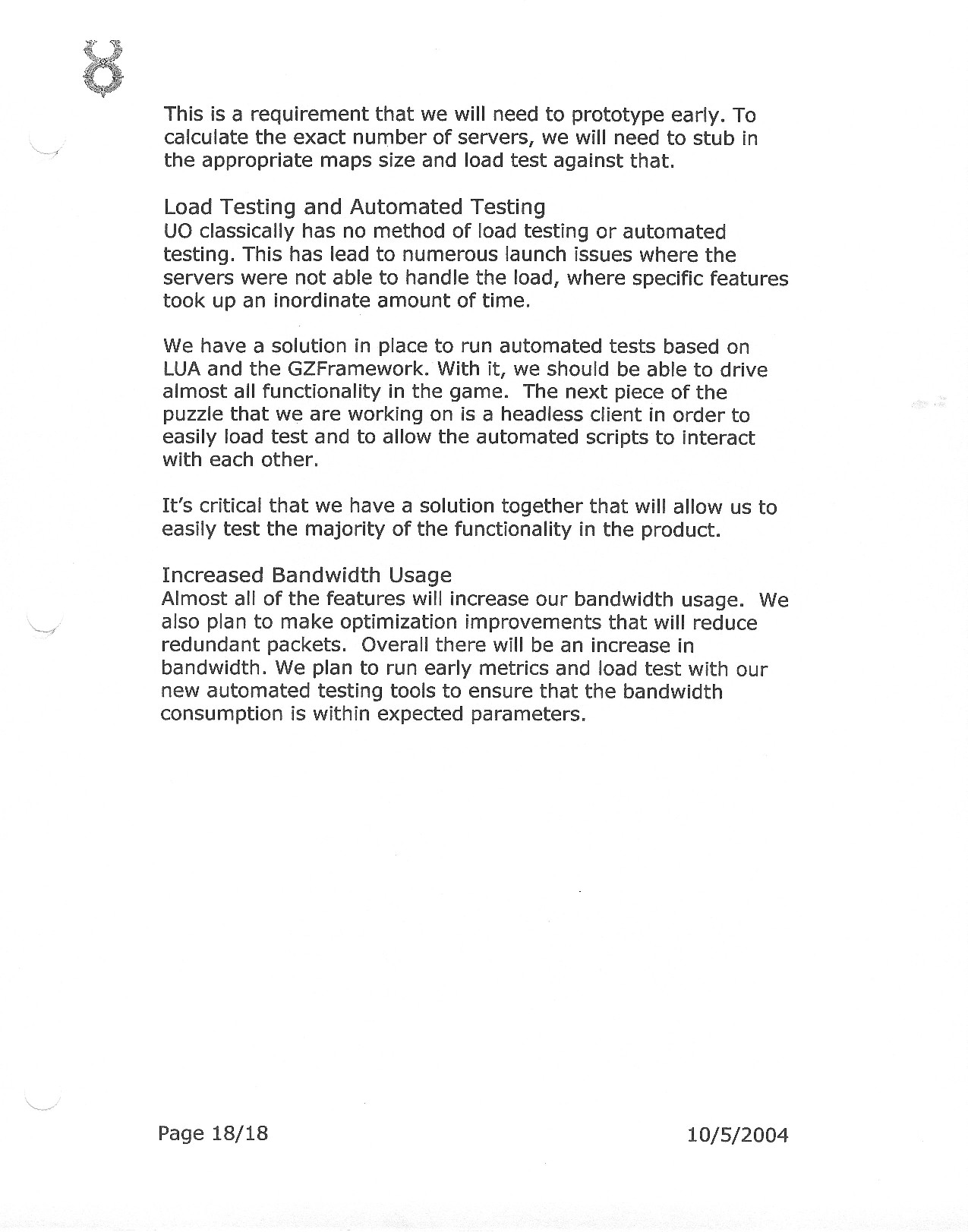 This document is dense, and disucsses almost all the technical details that would have concerned the Ultima Online 2 development team. Early in the document, for example, a comparison of different game engine technologies is performed, and it would appear that Maxis’ GZ engine (which powered The Sims 2, for example) had been chosen as the engine that would power the game. (The Renderware engine was chosen as a backup plan.) Later on in the document, the intentory UI and paperdolling system get discussed.