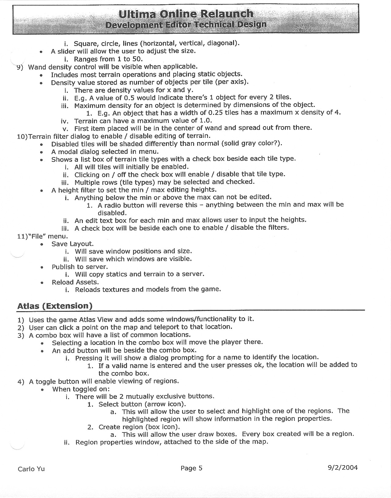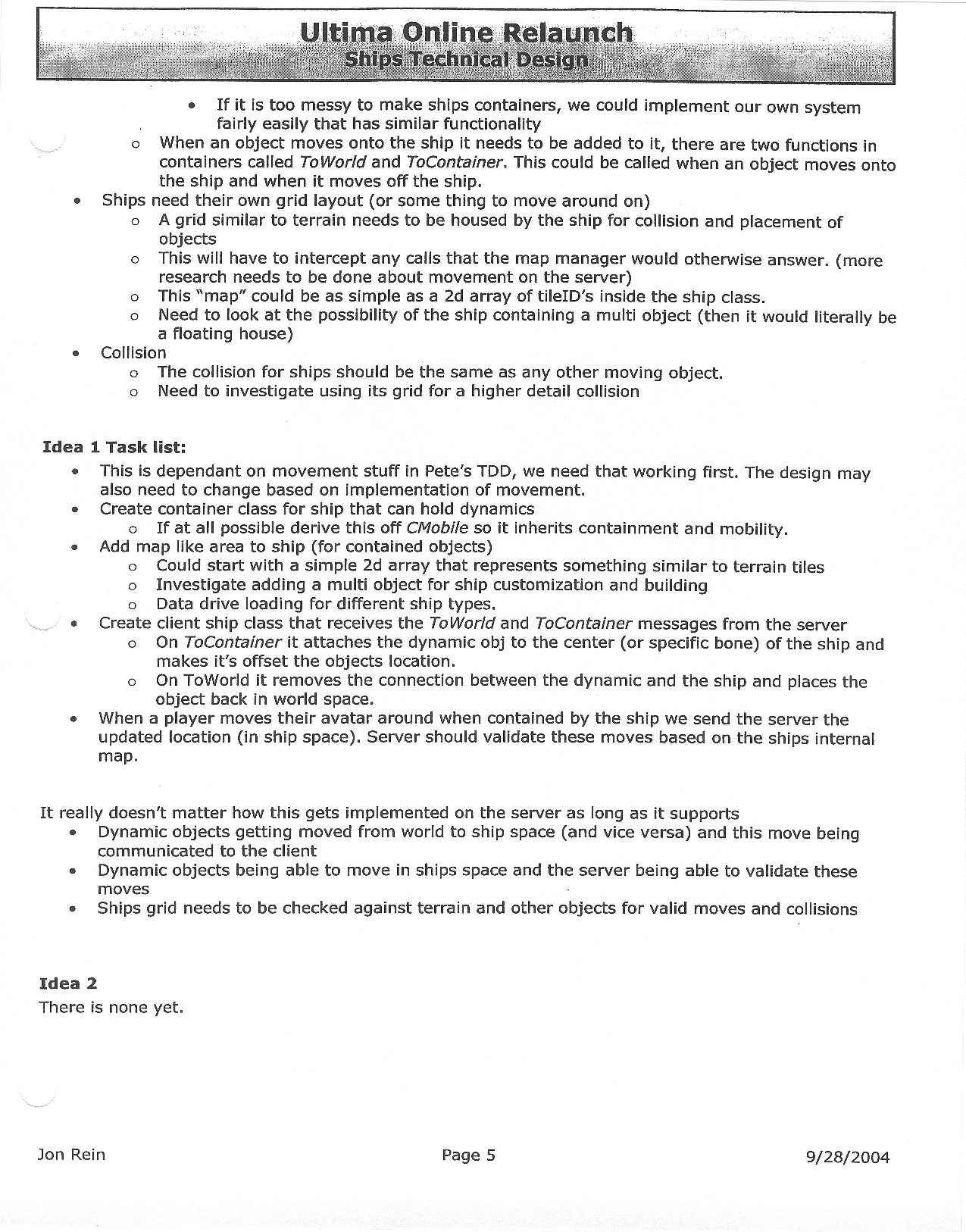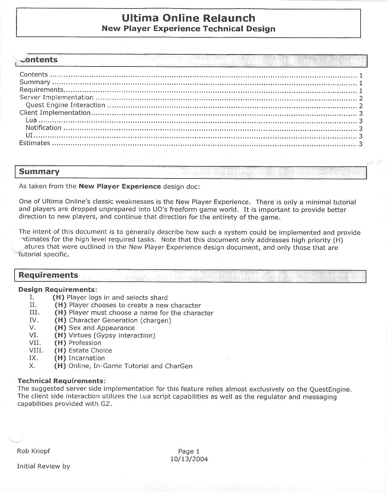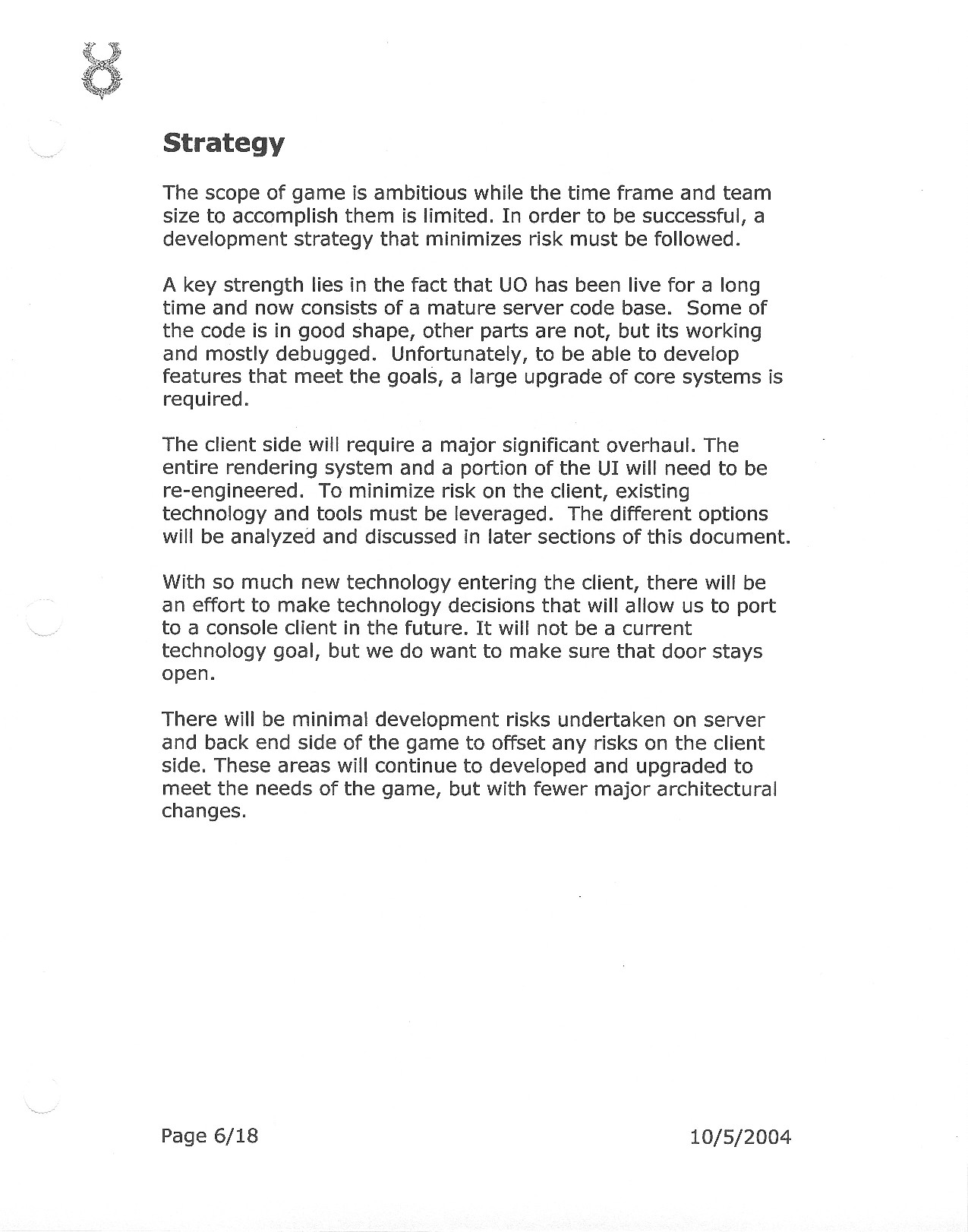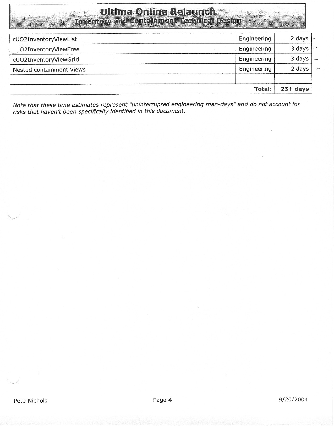 This document is dense, and disucsses almost all the technical details that would have concerned the Ultima Online 2 development team. Early in the document, for example, a comparison of different game engine technologies is performed, and it would appear that Maxis’ GZ engine (which powered The Sims 2, for example) had been chosen as the engine that would power the game. (The Renderware engine was chosen as a backup plan.) Later on in the document, the intentory UI and paperdolling system get discussed.