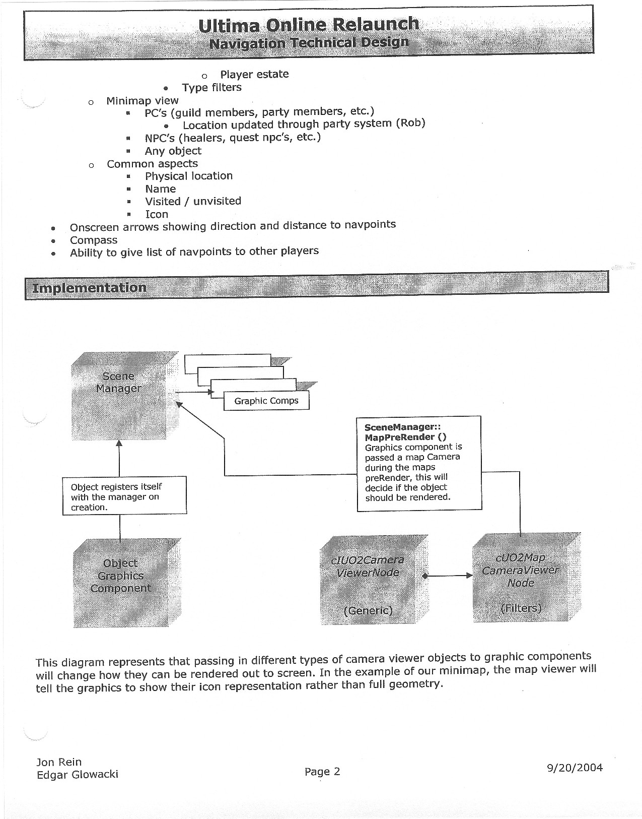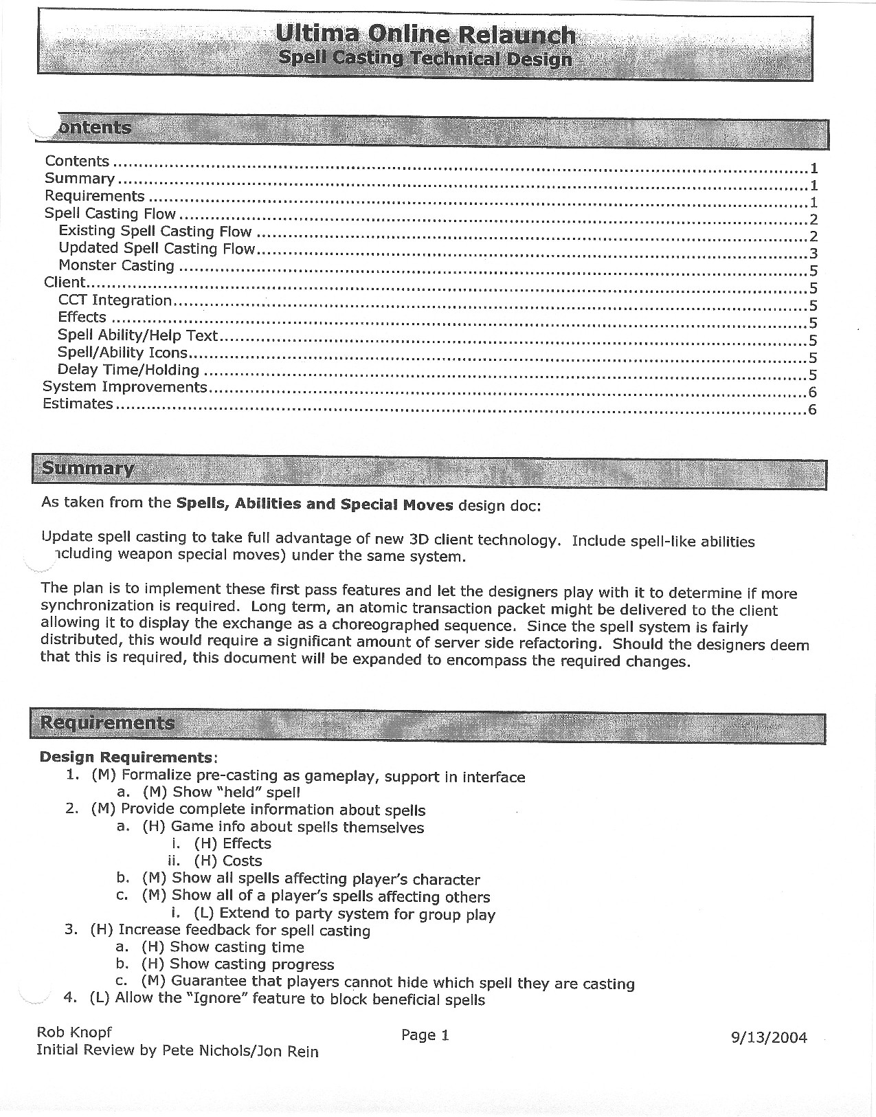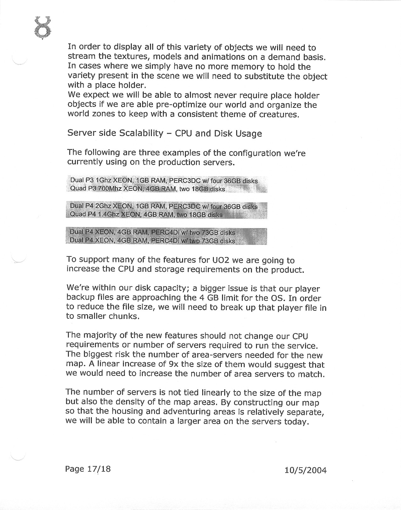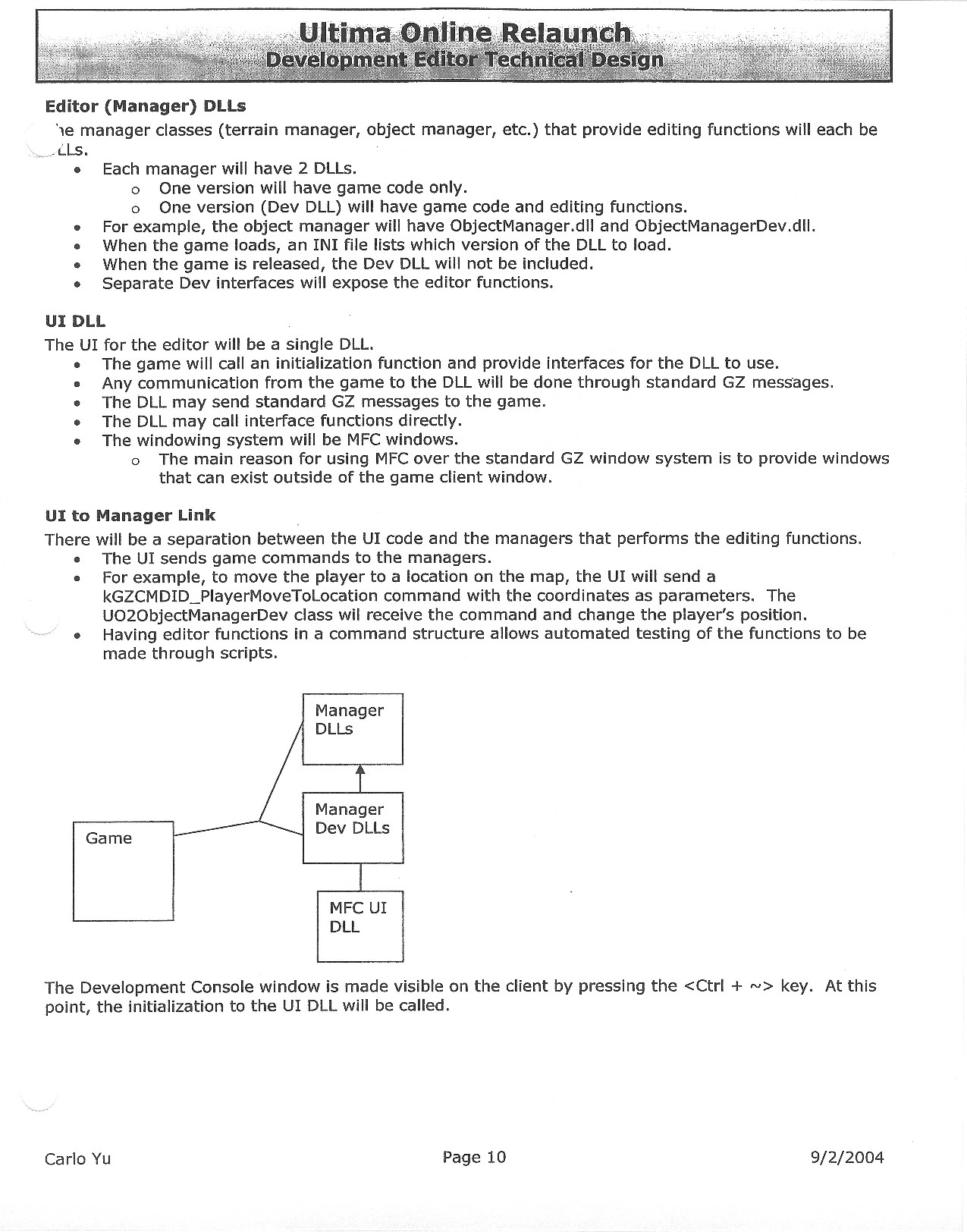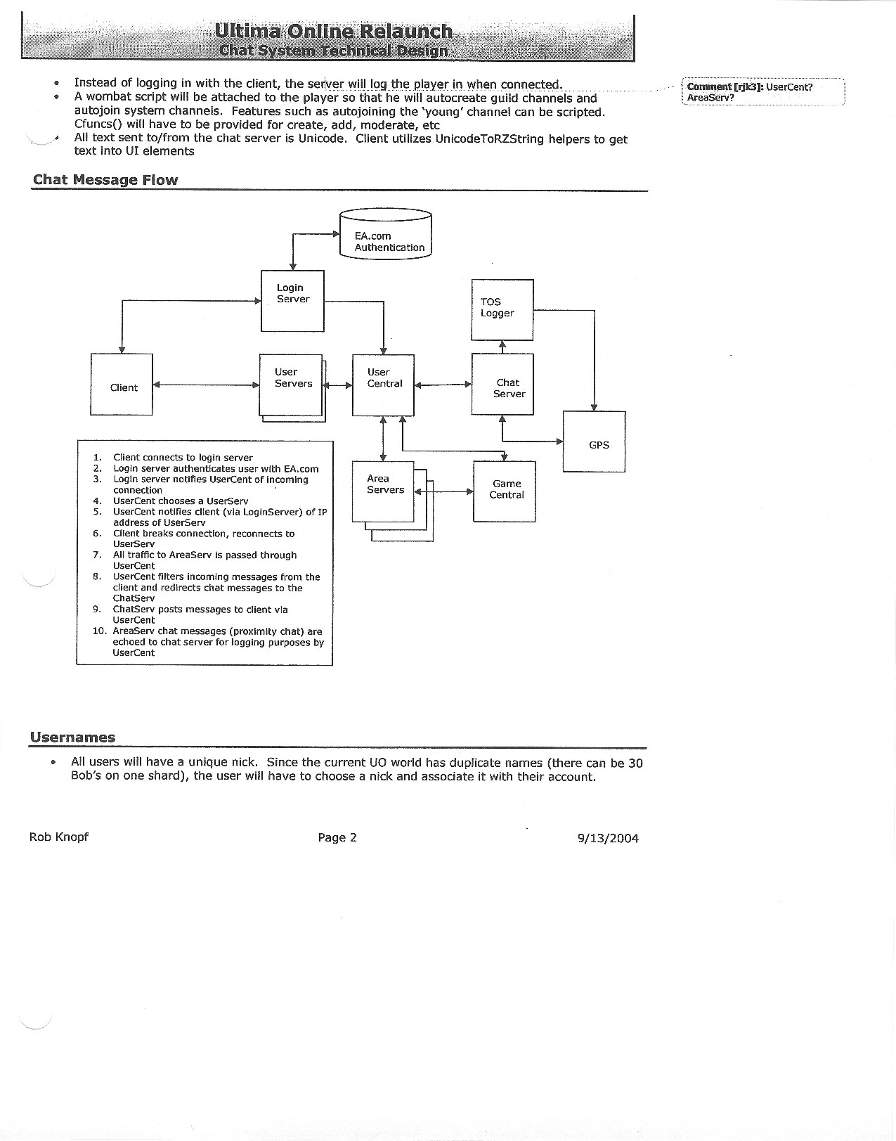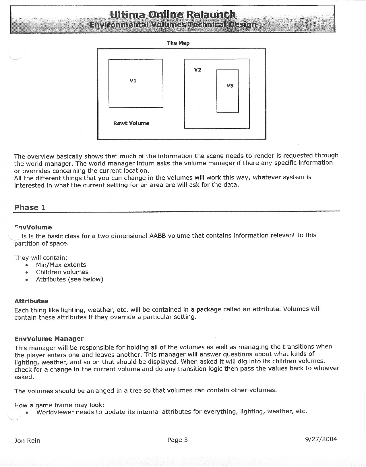 This document is dense, and disucsses almost all the technical details that would have concerned the Ultima Online 2 development team. Early in the document, for example, a comparison of different game engine technologies is performed, and it would appear that Maxis’ GZ engine (which powered The Sims 2, for example) had been chosen as the engine that would power the game. (The Renderware engine was chosen as a backup plan.) Later on in the document, the intentory UI and paperdolling system get discussed.