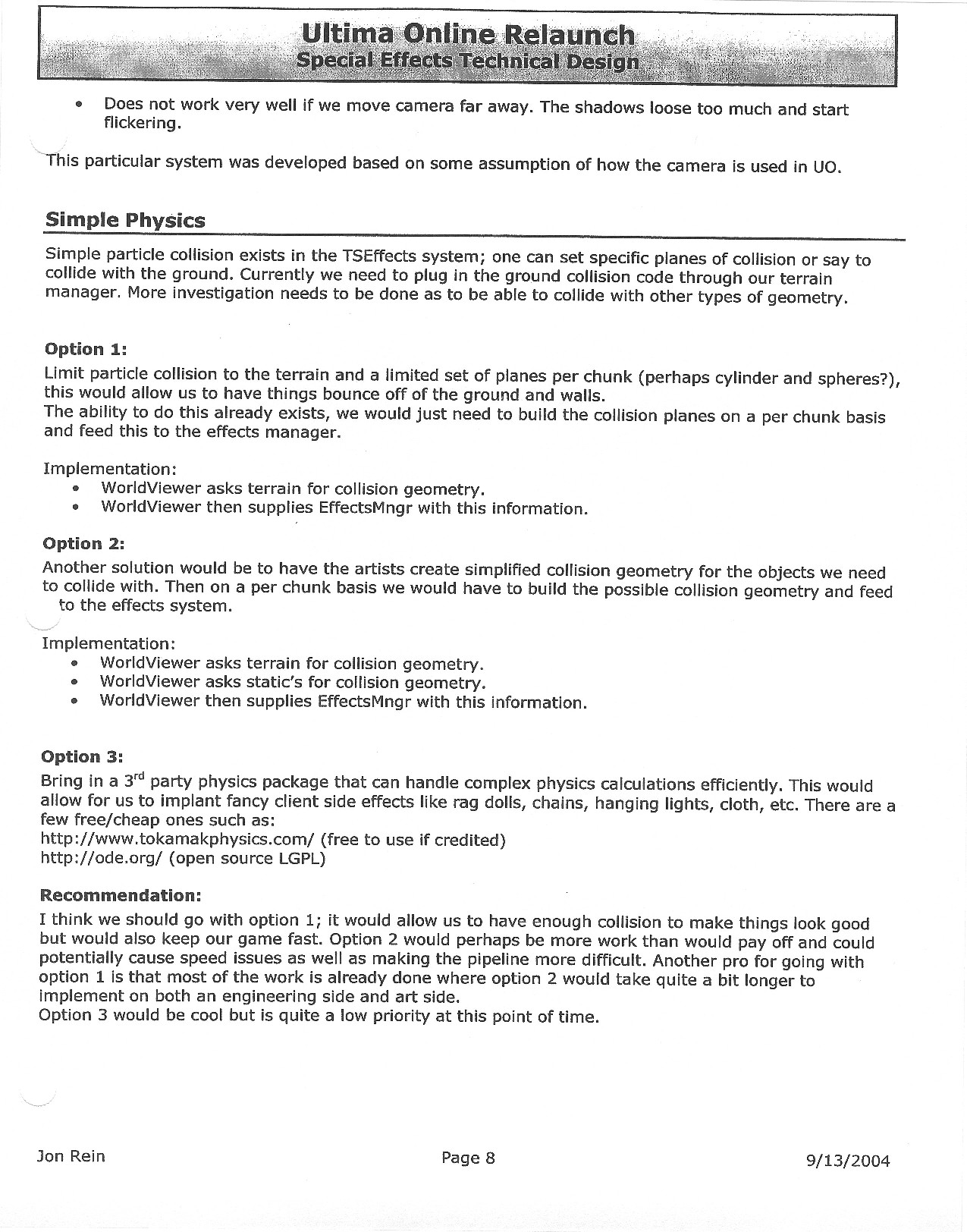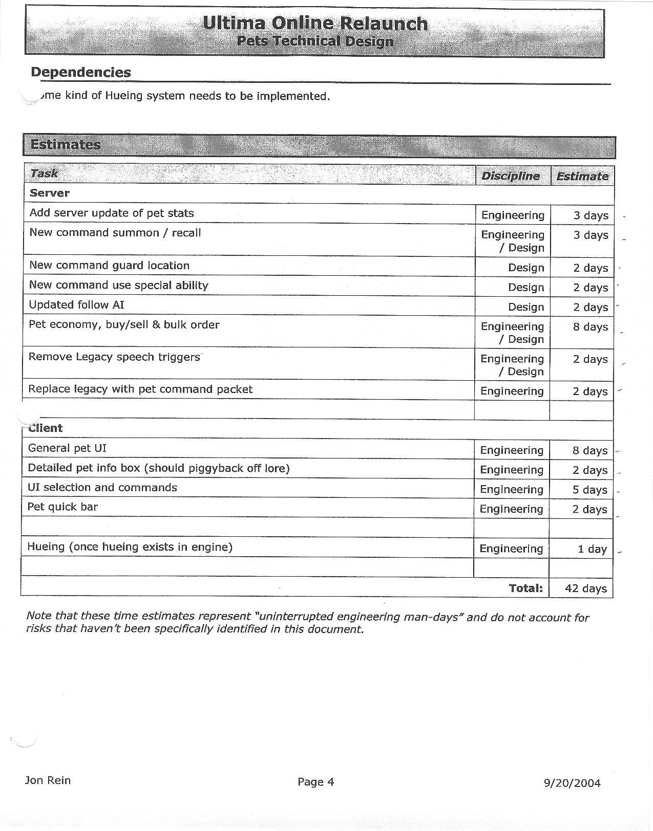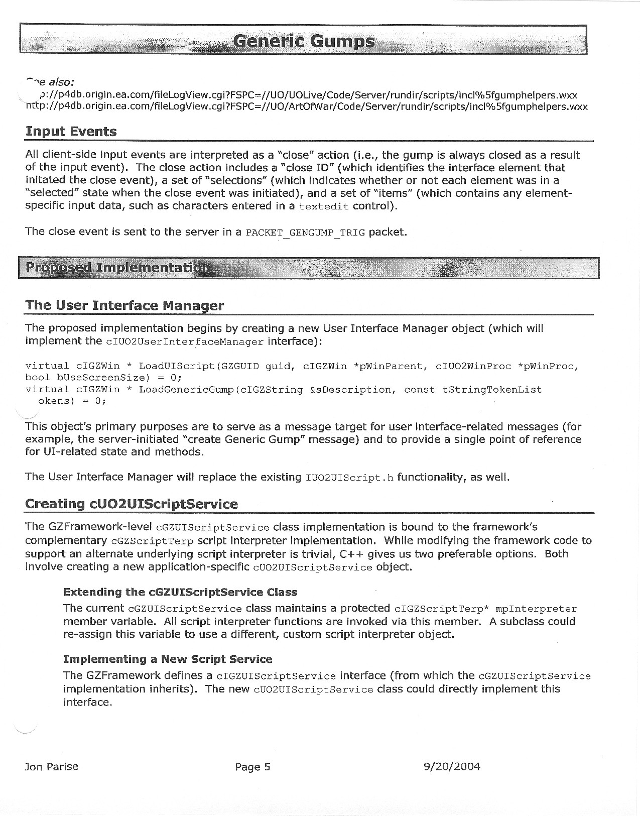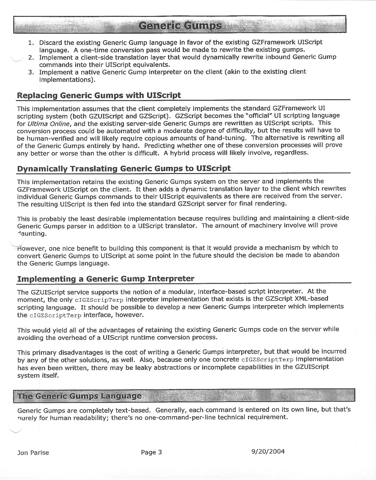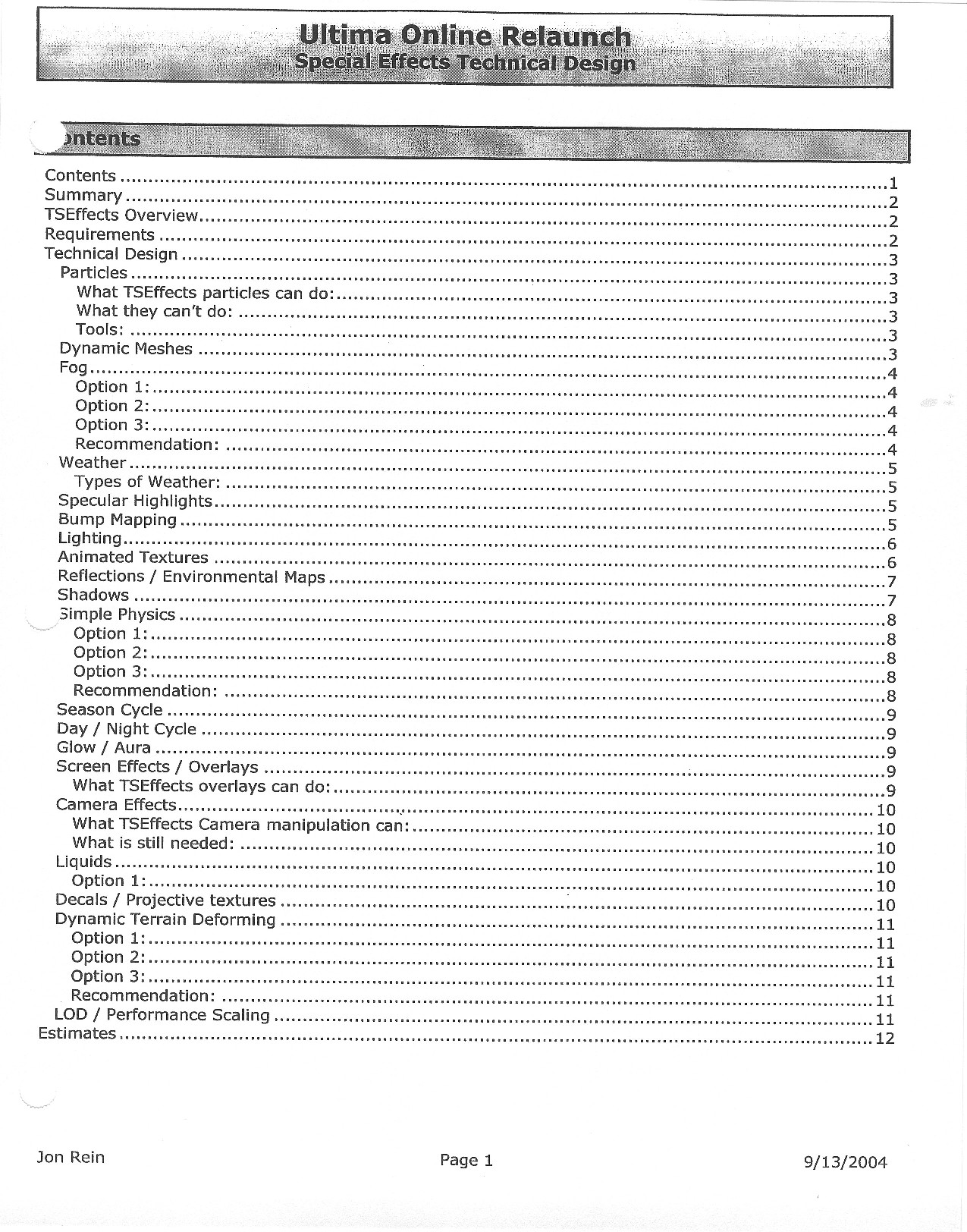 This document is dense, and disucsses almost all the technical details that would have concerned the Ultima Online 2 development team. Early in the document, for example, a comparison of different game engine technologies is performed, and it would appear that Maxis’ GZ engine (which powered The Sims 2, for example) had been chosen as the engine that would power the game. (The Renderware engine was chosen as a backup plan.) Later on in the document, the intentory UI and paperdolling system get discussed.