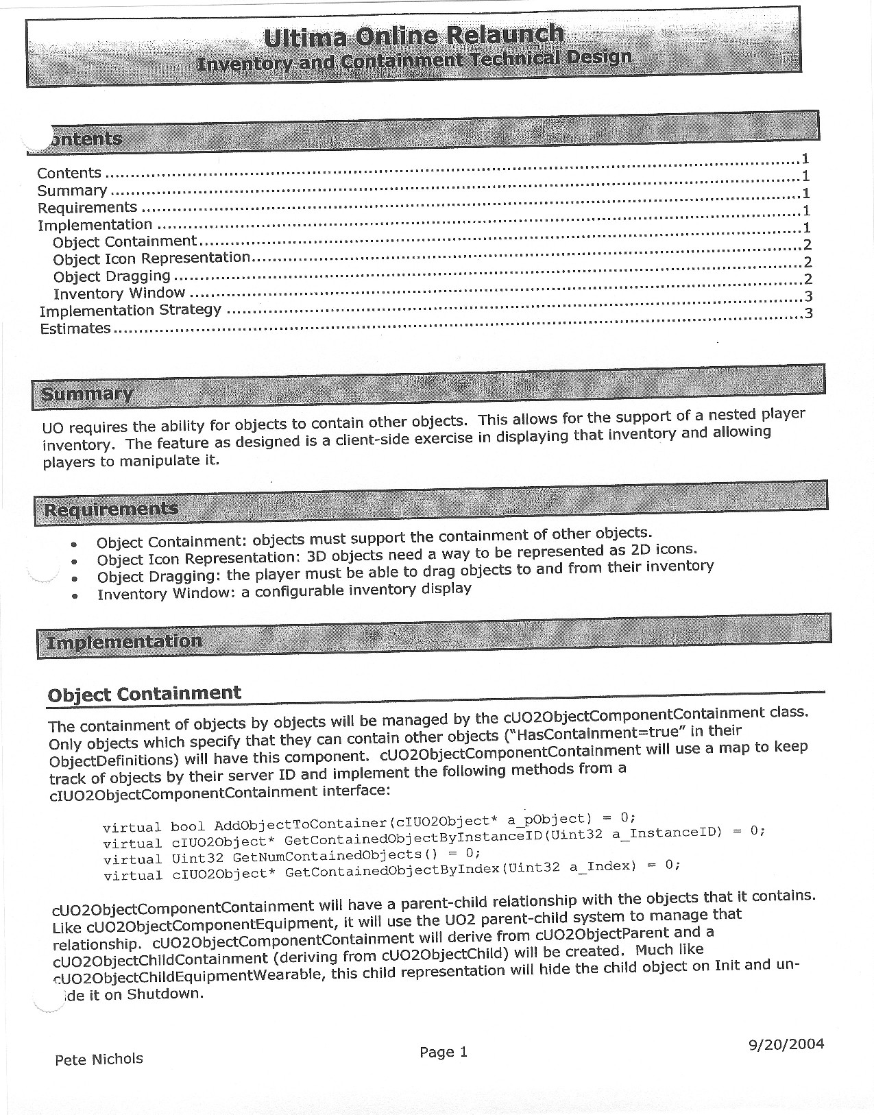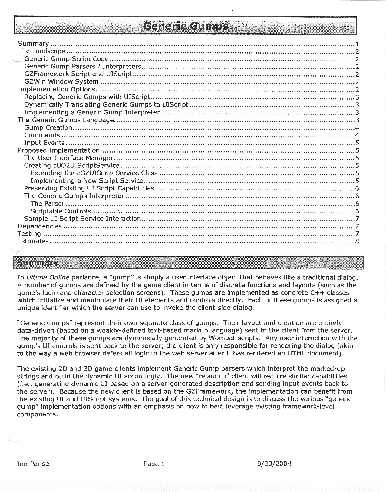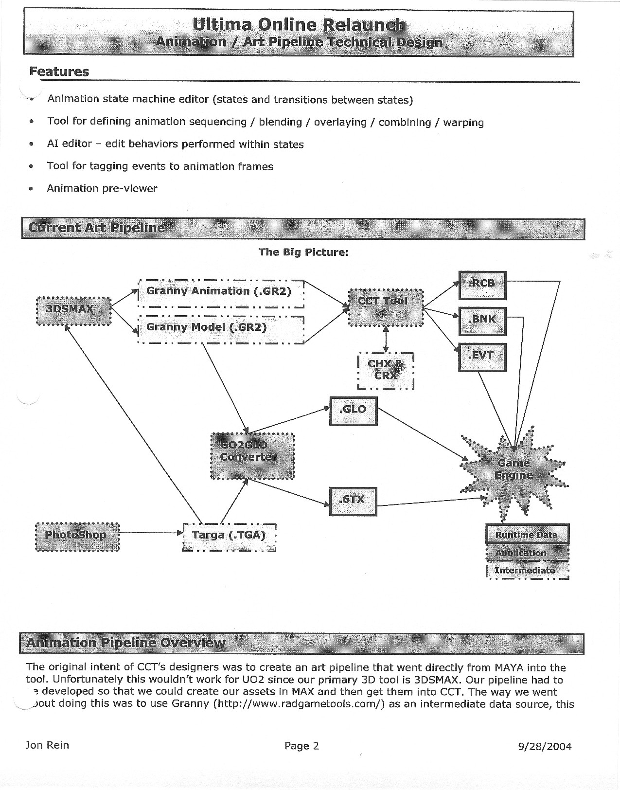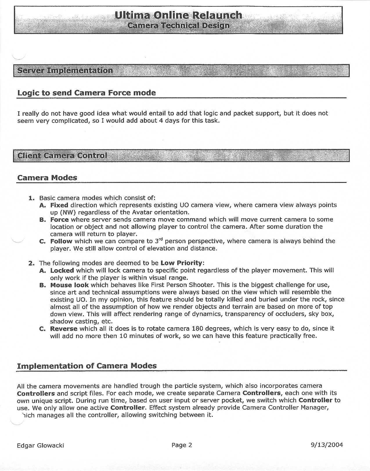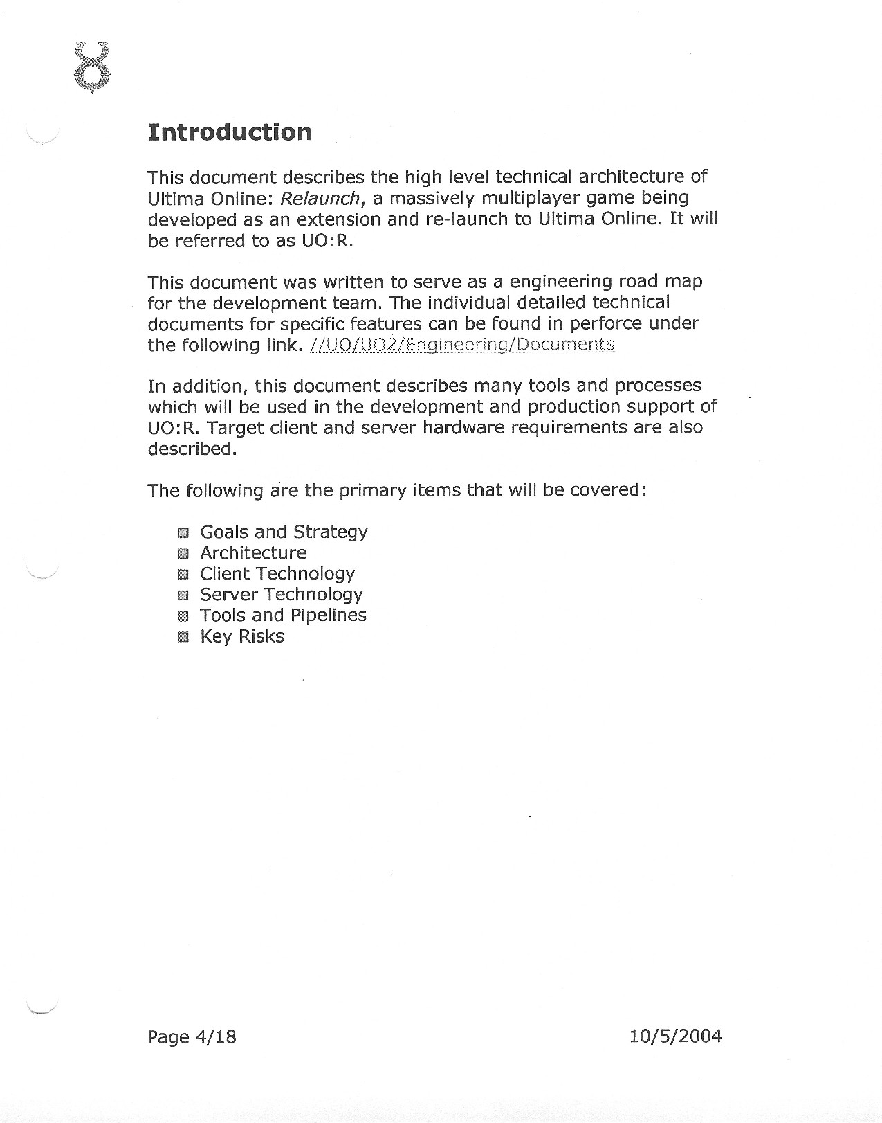 This document is dense, and disucsses almost all the technical details that would have concerned the Ultima Online 2 development team. Early in the document, for example, a comparison of different game engine technologies is performed, and it would appear that Maxis’ GZ engine (which powered The Sims 2, for example) had been chosen as the engine that would power the game. (The Renderware engine was chosen as a backup plan.) Later on in the document, the intentory UI and paperdolling system get discussed.