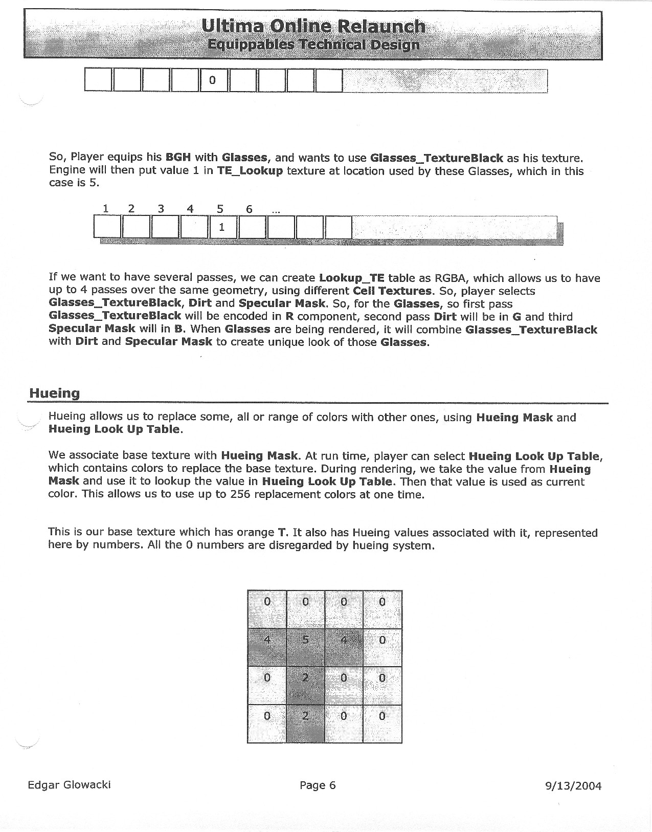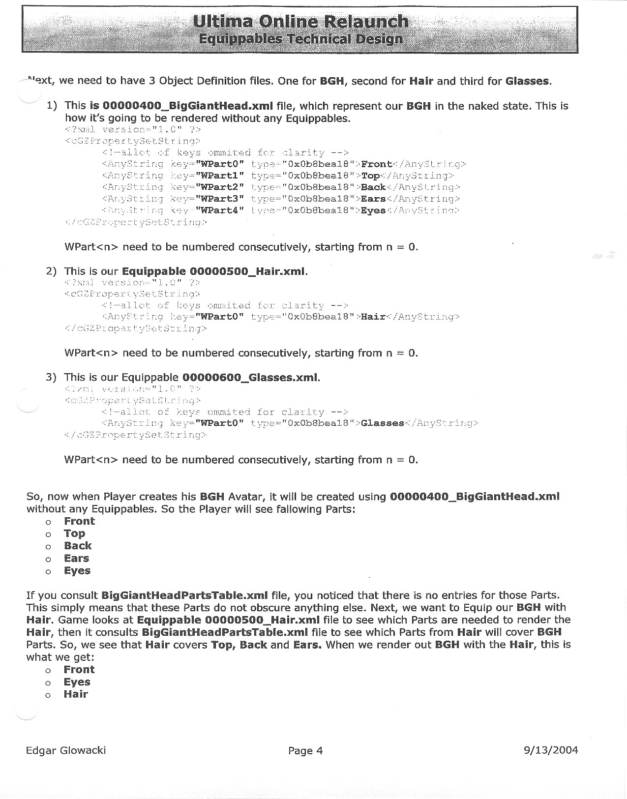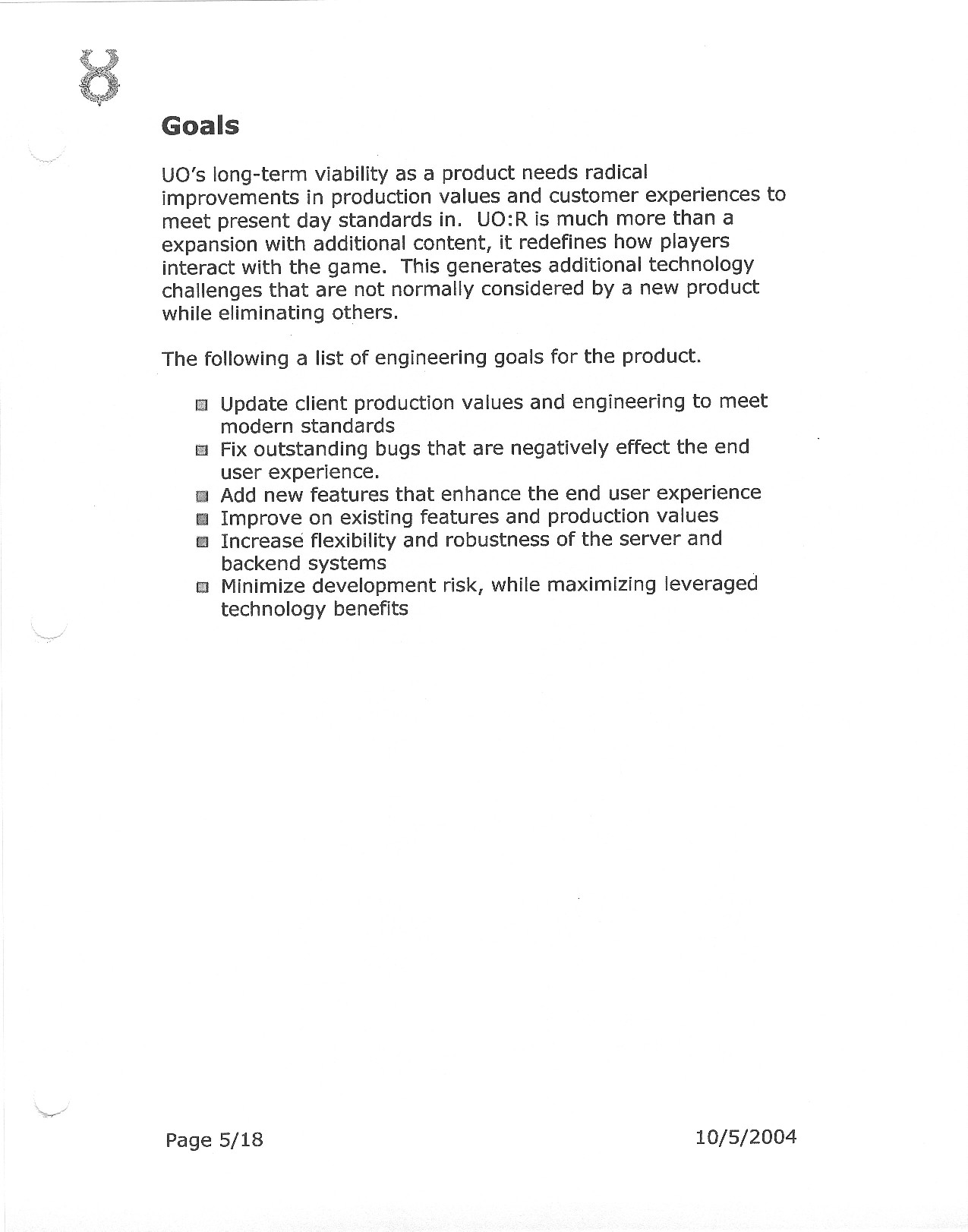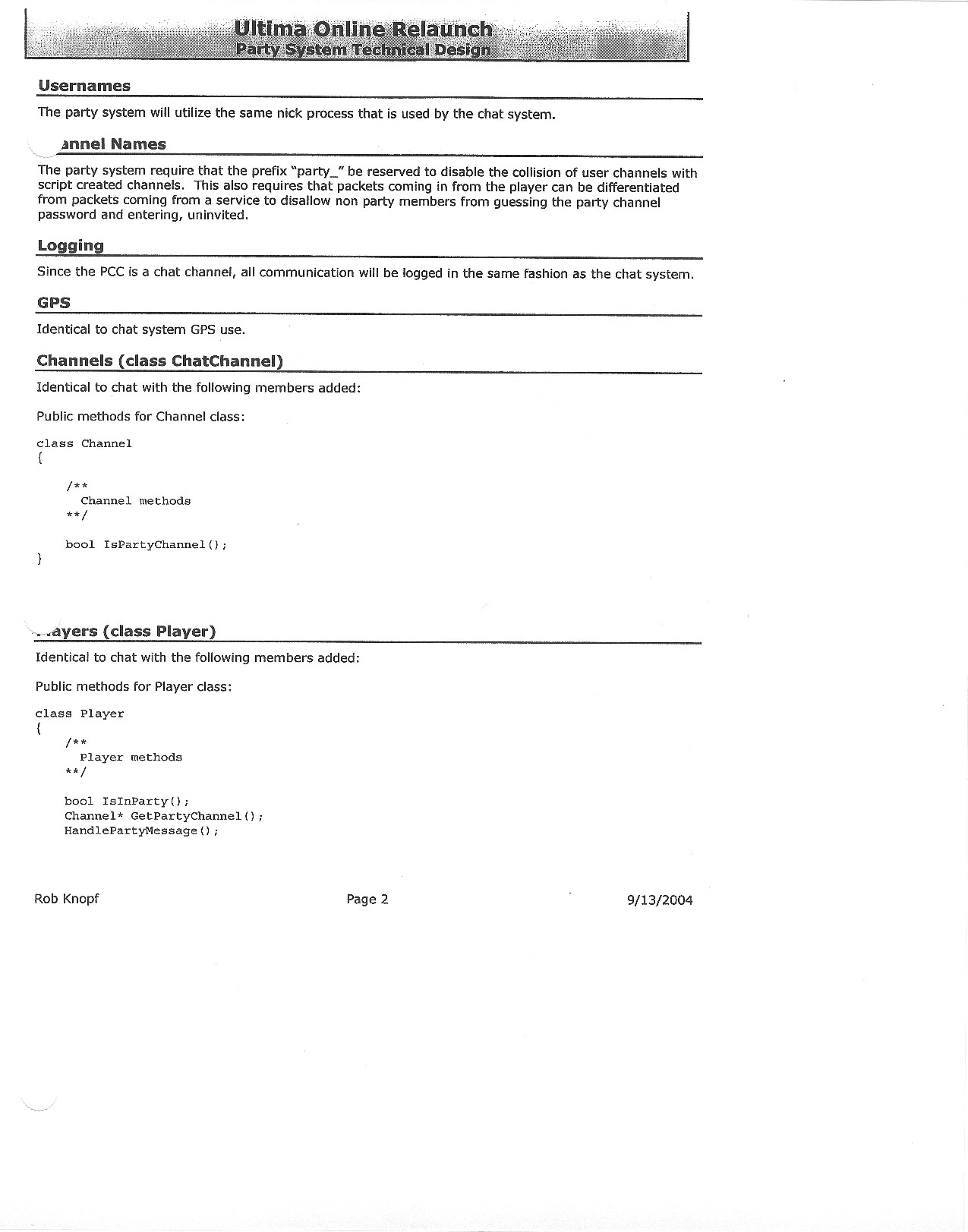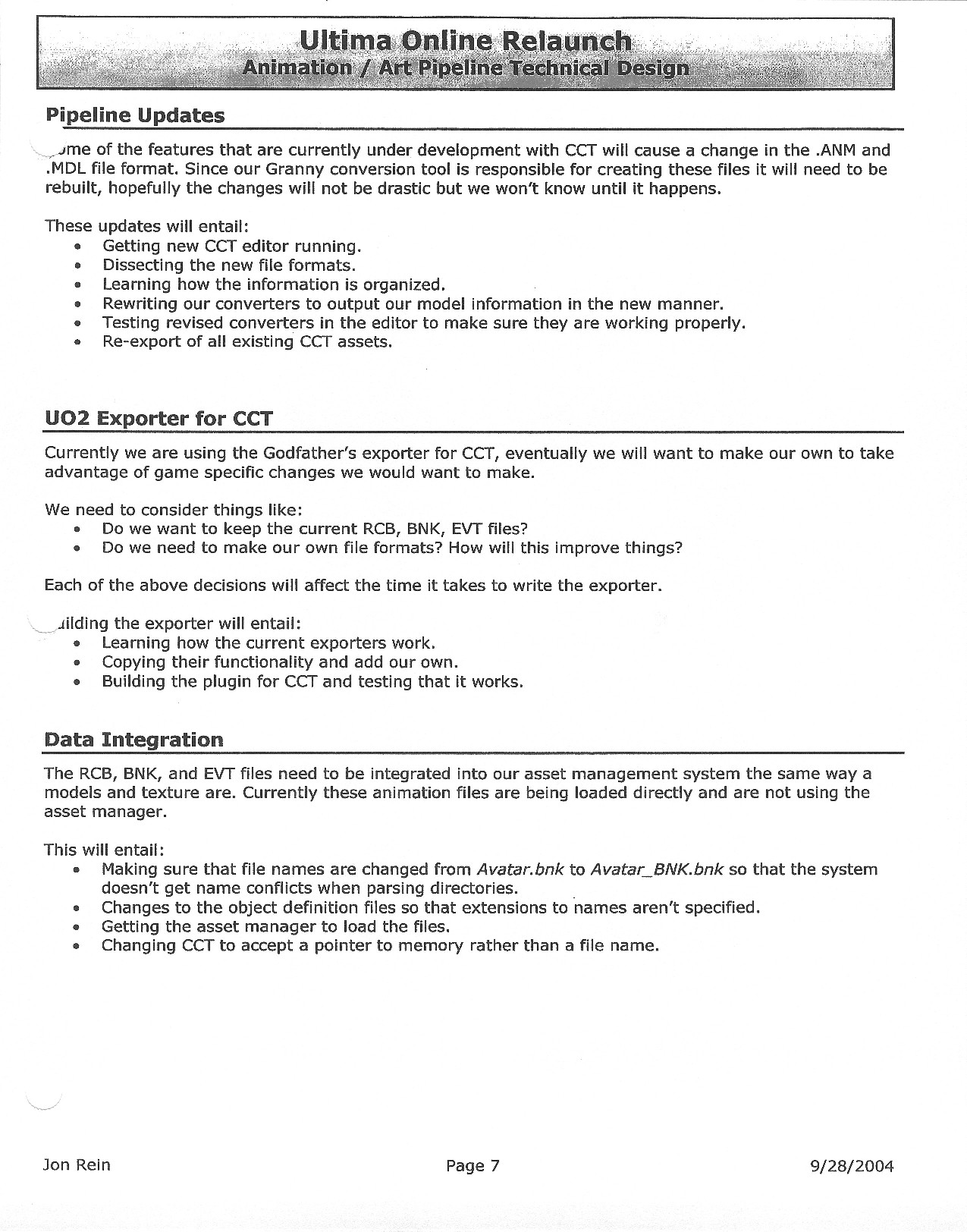 This document is dense, and disucsses almost all the technical details that would have concerned the Ultima Online 2 development team. Early in the document, for example, a comparison of different game engine technologies is performed, and it would appear that Maxis’ GZ engine (which powered The Sims 2, for example) had been chosen as the engine that would power the game. (The Renderware engine was chosen as a backup plan.) Later on in the document, the intentory UI and paperdolling system get discussed.