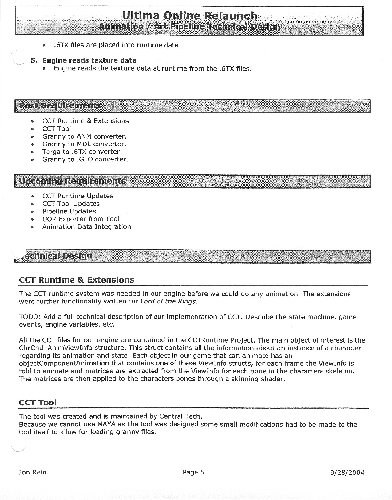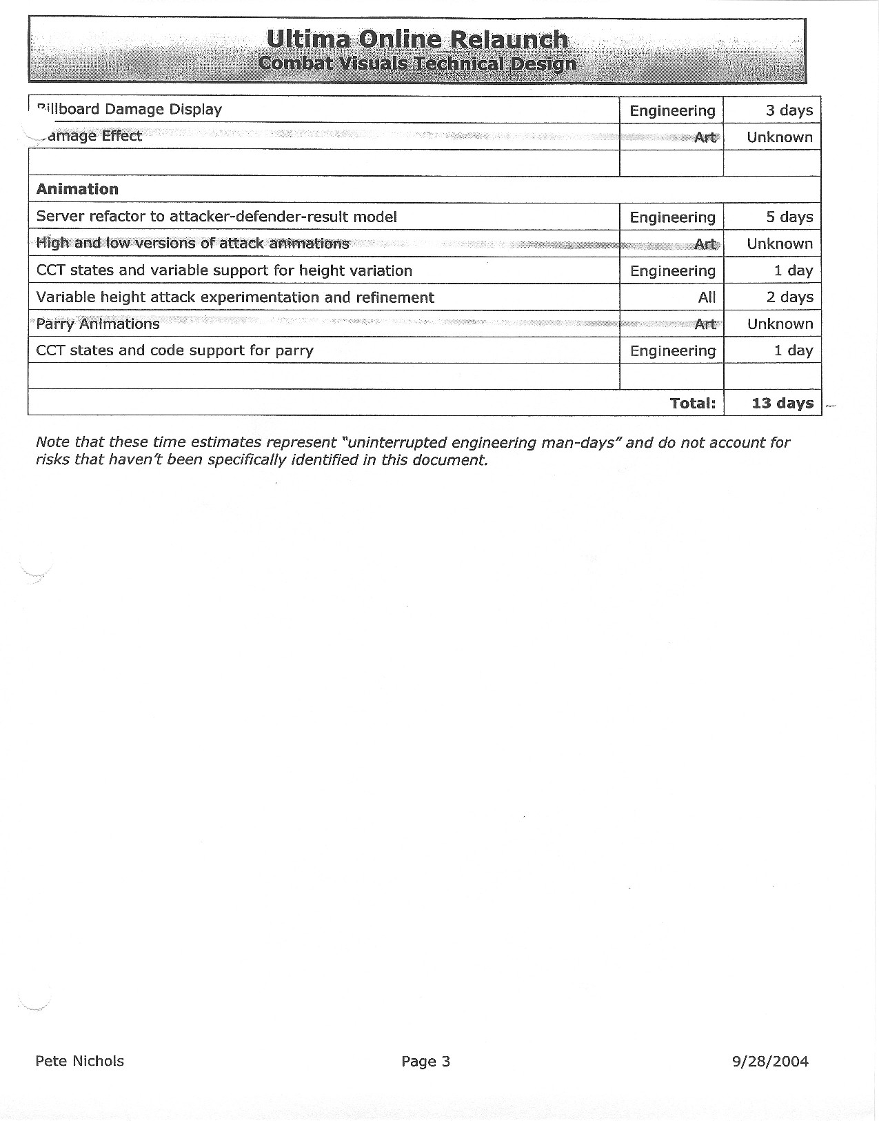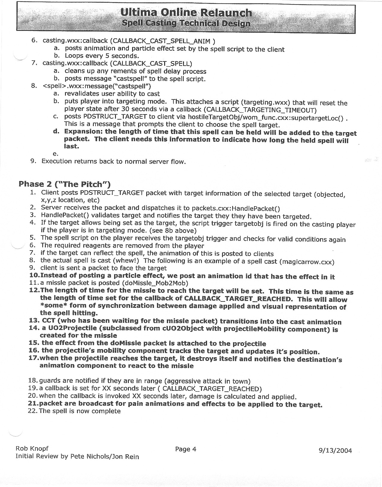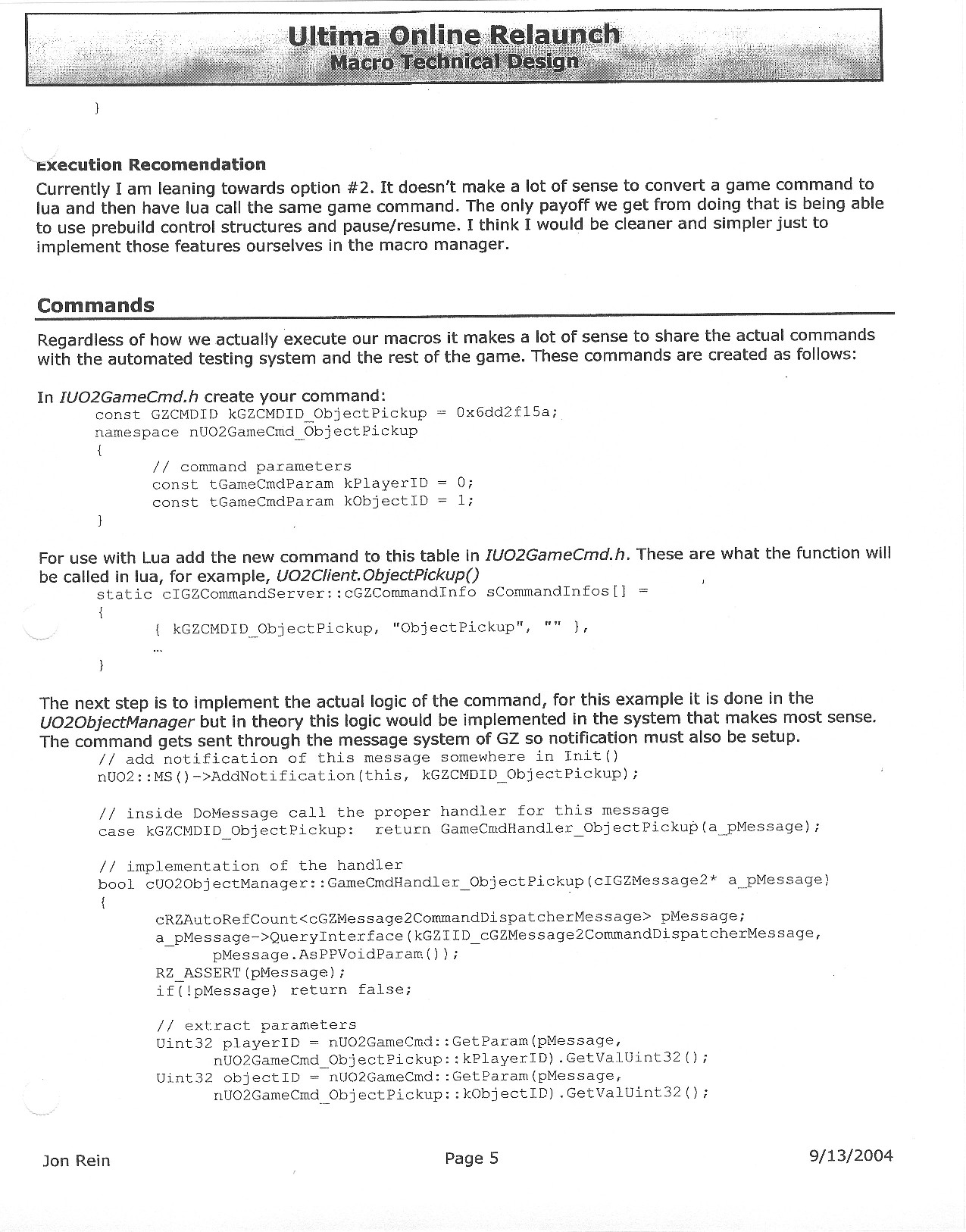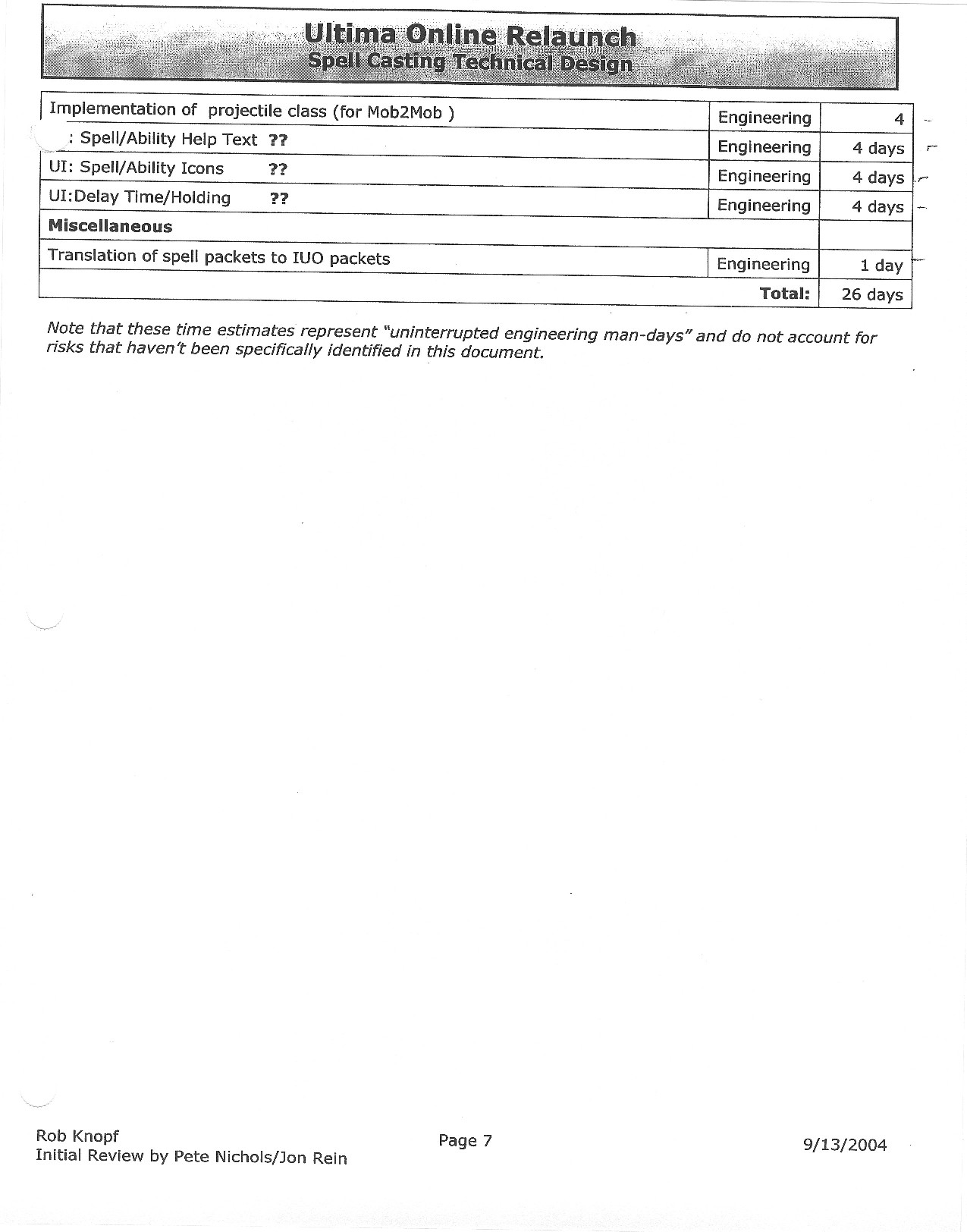 This document is dense, and disucsses almost all the technical details that would have concerned the Ultima Online 2 development team. Early in the document, for example, a comparison of different game engine technologies is performed, and it would appear that Maxis’ GZ engine (which powered The Sims 2, for example) had been chosen as the engine that would power the game. (The Renderware engine was chosen as a backup plan.) Later on in the document, the intentory UI and paperdolling system get discussed.