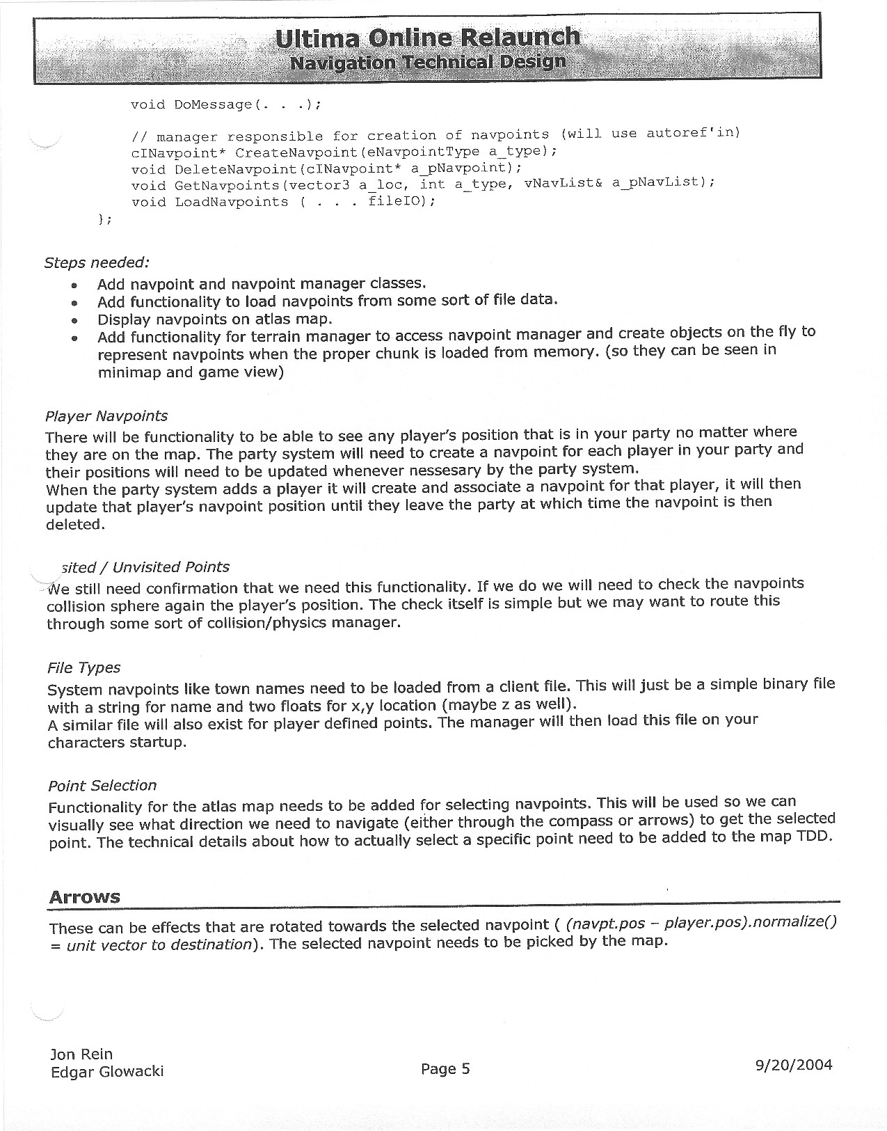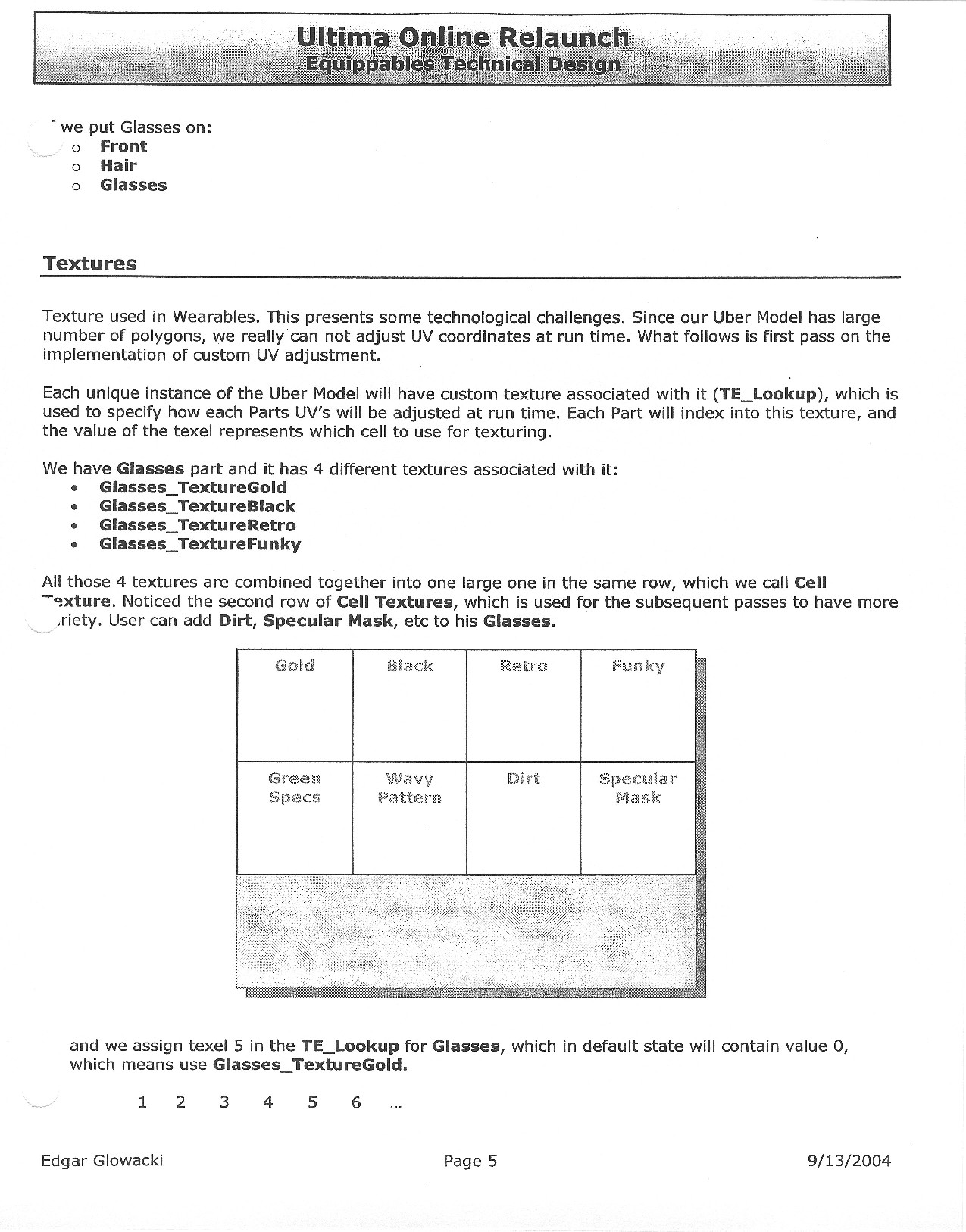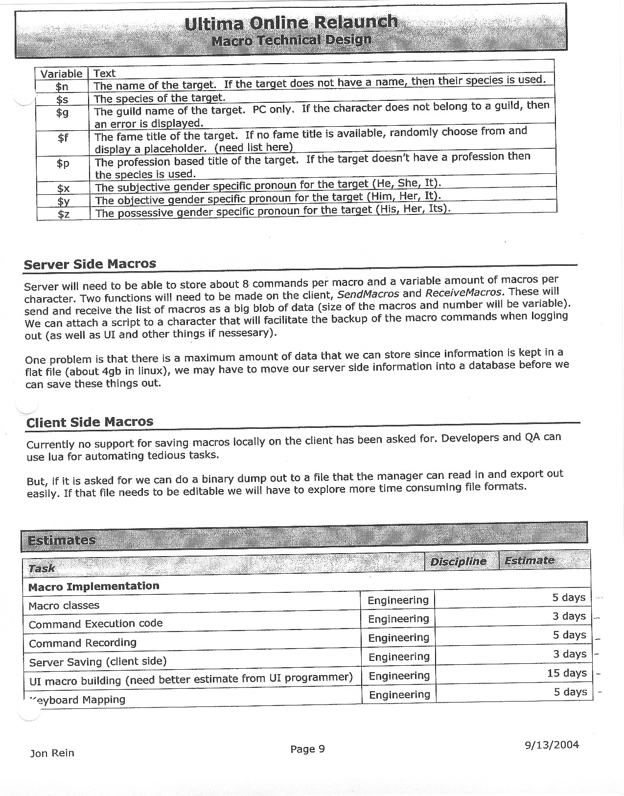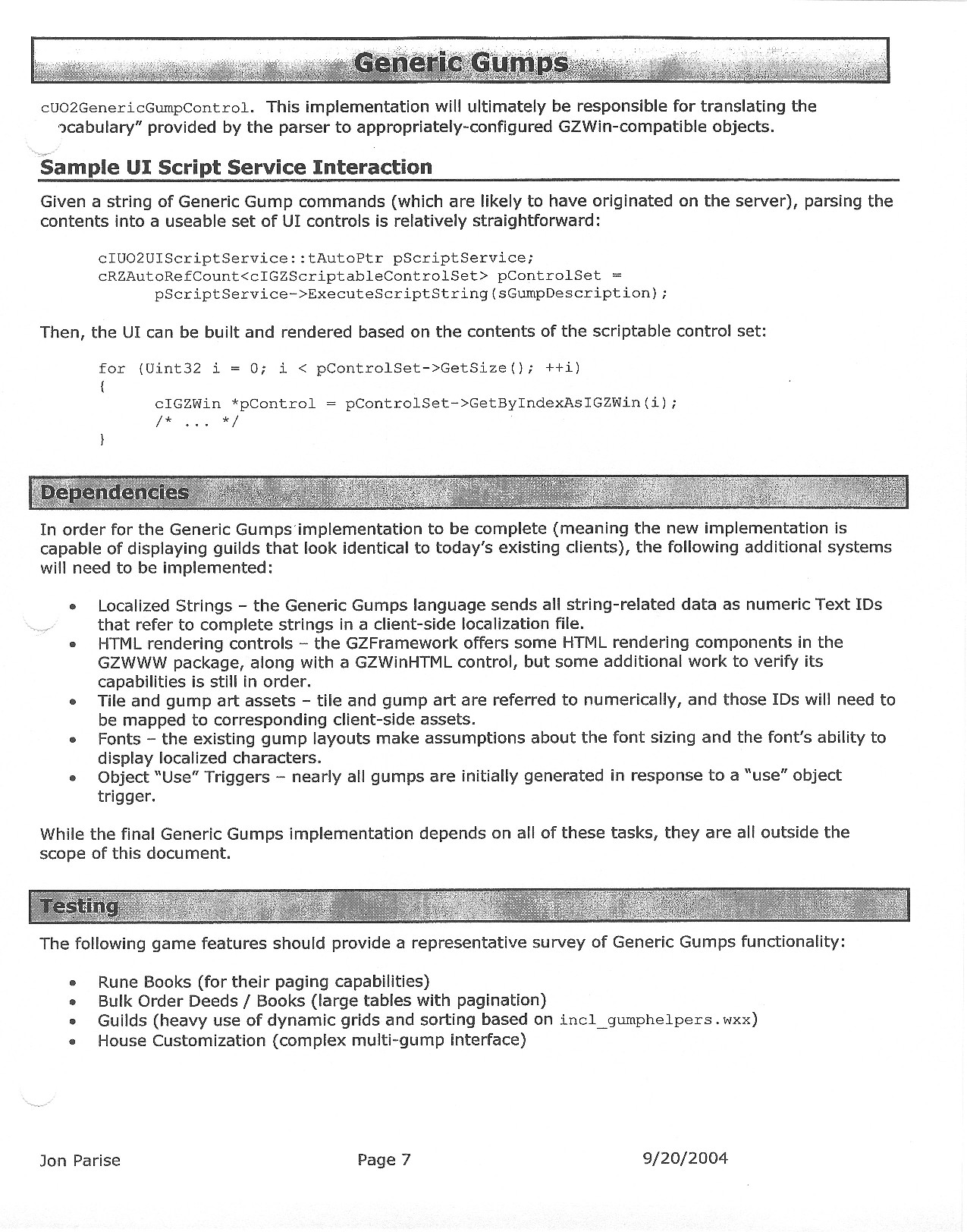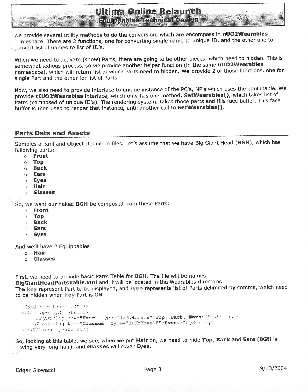 This document is dense, and disucsses almost all the technical details that would have concerned the Ultima Online 2 development team. Early in the document, for example, a comparison of different game engine technologies is performed, and it would appear that Maxis’ GZ engine (which powered The Sims 2, for example) had been chosen as the engine that would power the game. (The Renderware engine was chosen as a backup plan.) Later on in the document, the intentory UI and paperdolling system get discussed.