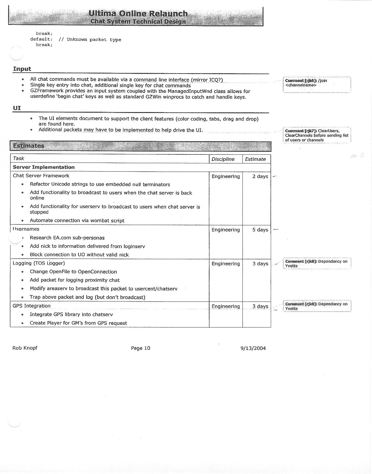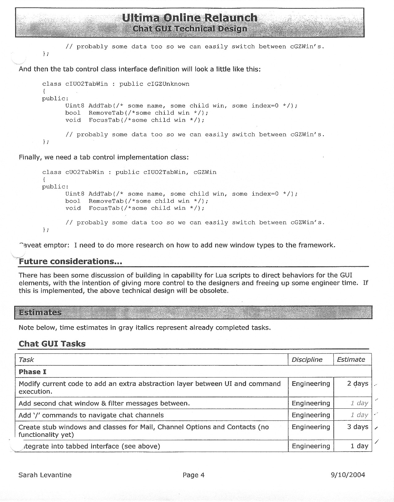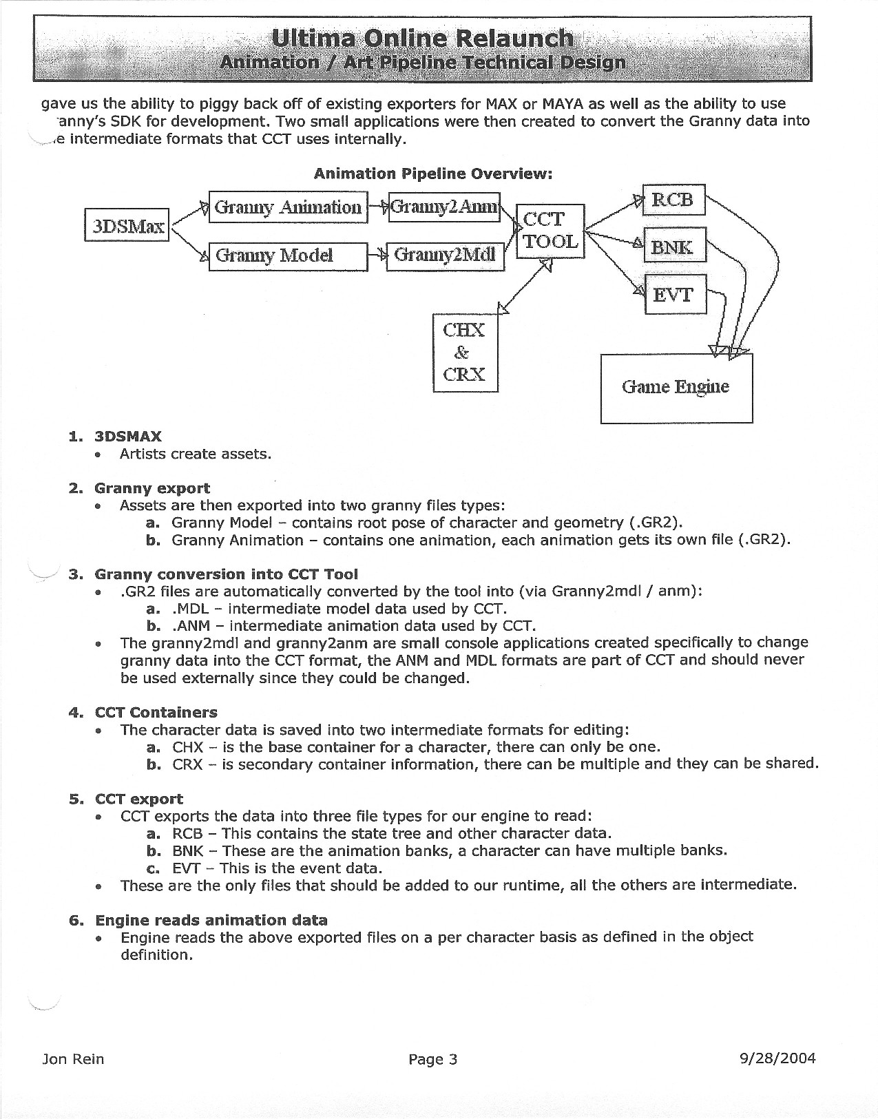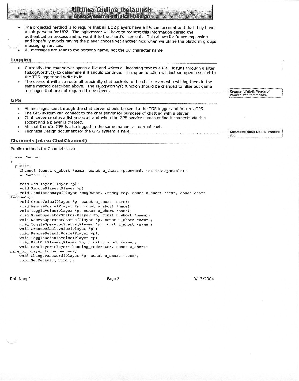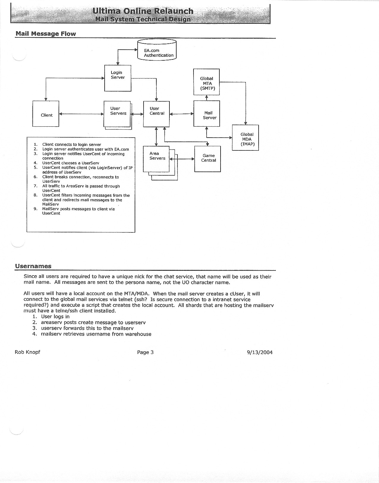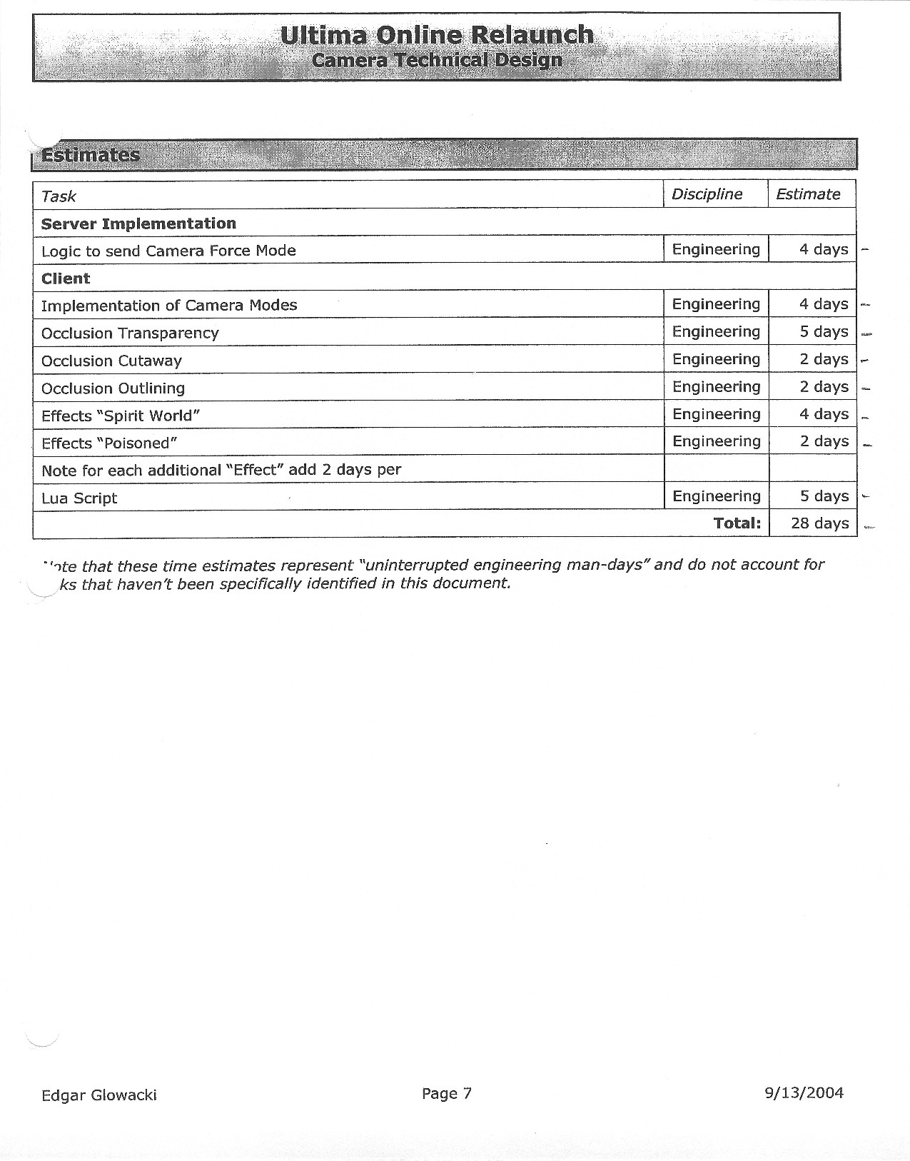 This document is dense, and disucsses almost all the technical details that would have concerned the Ultima Online 2 development team. Early in the document, for example, a comparison of different game engine technologies is performed, and it would appear that Maxis’ GZ engine (which powered The Sims 2, for example) had been chosen as the engine that would power the game. (The Renderware engine was chosen as a backup plan.) Later on in the document, the intentory UI and paperdolling system get discussed.