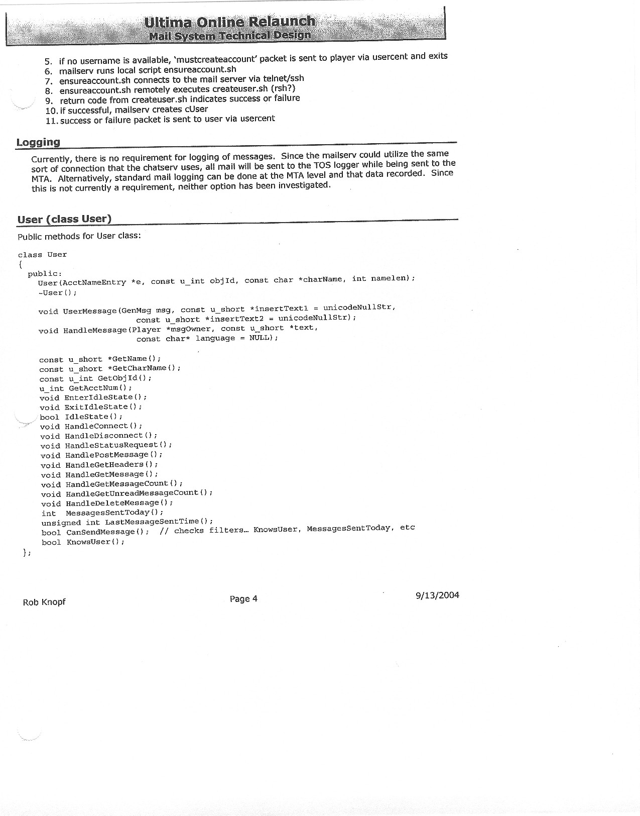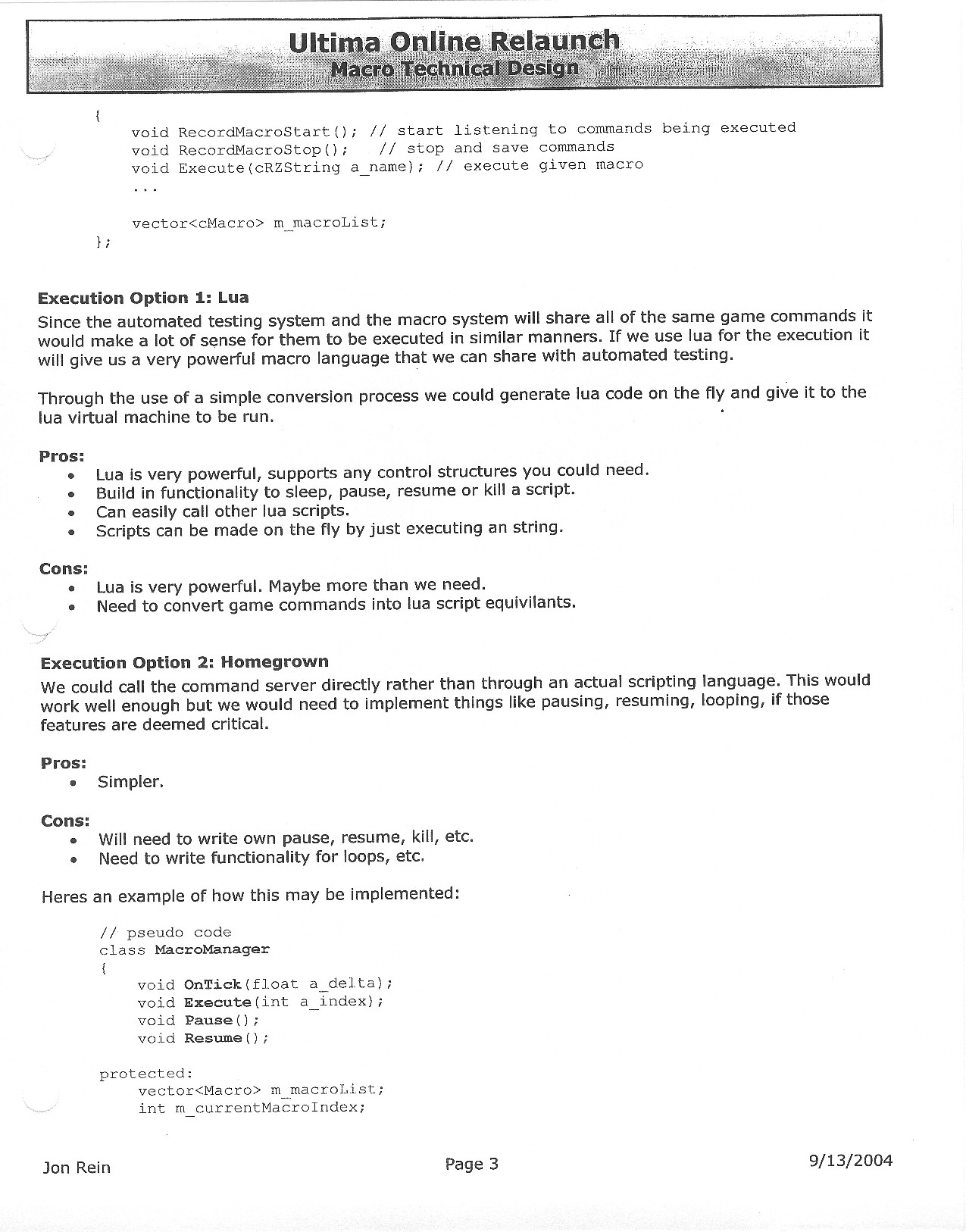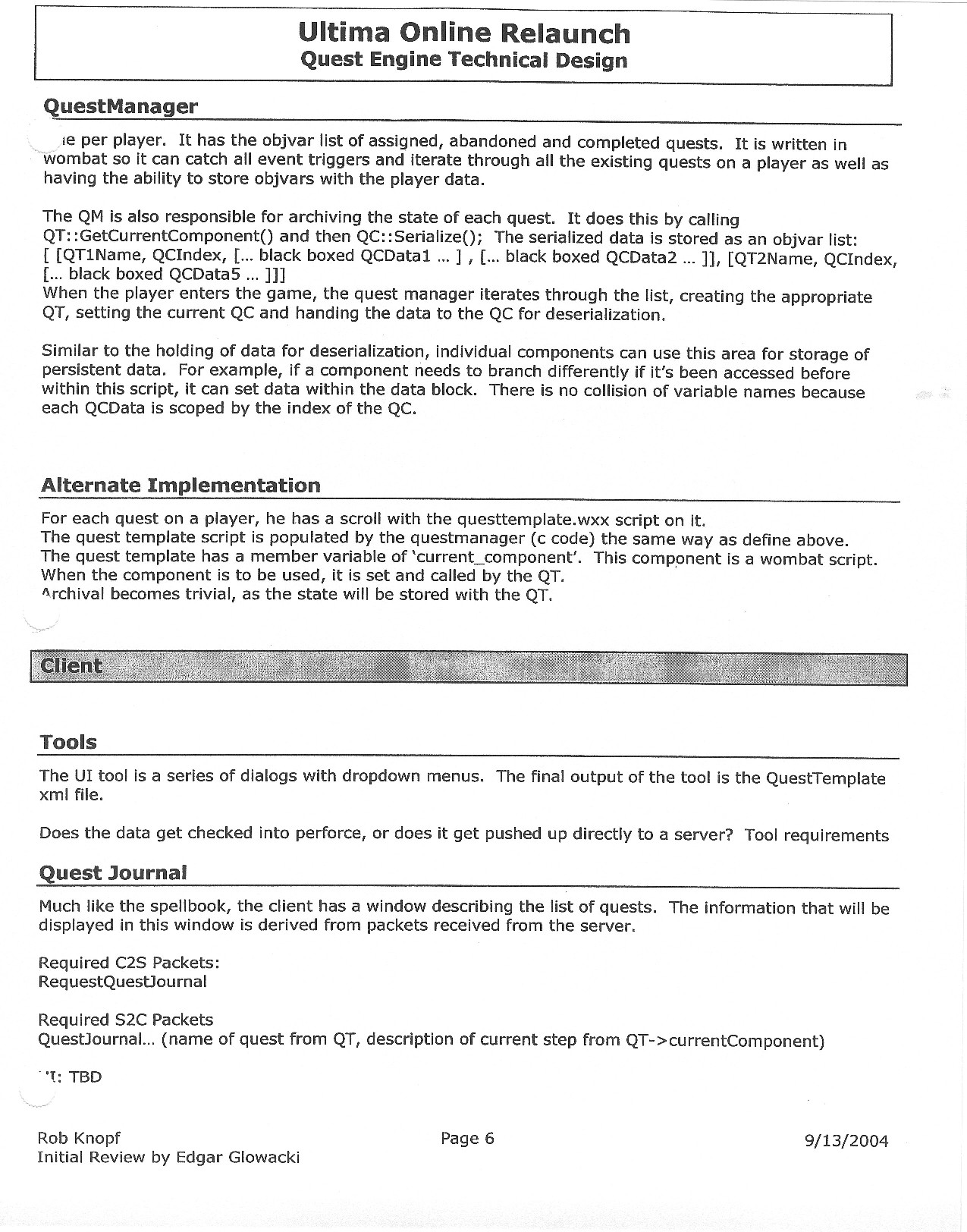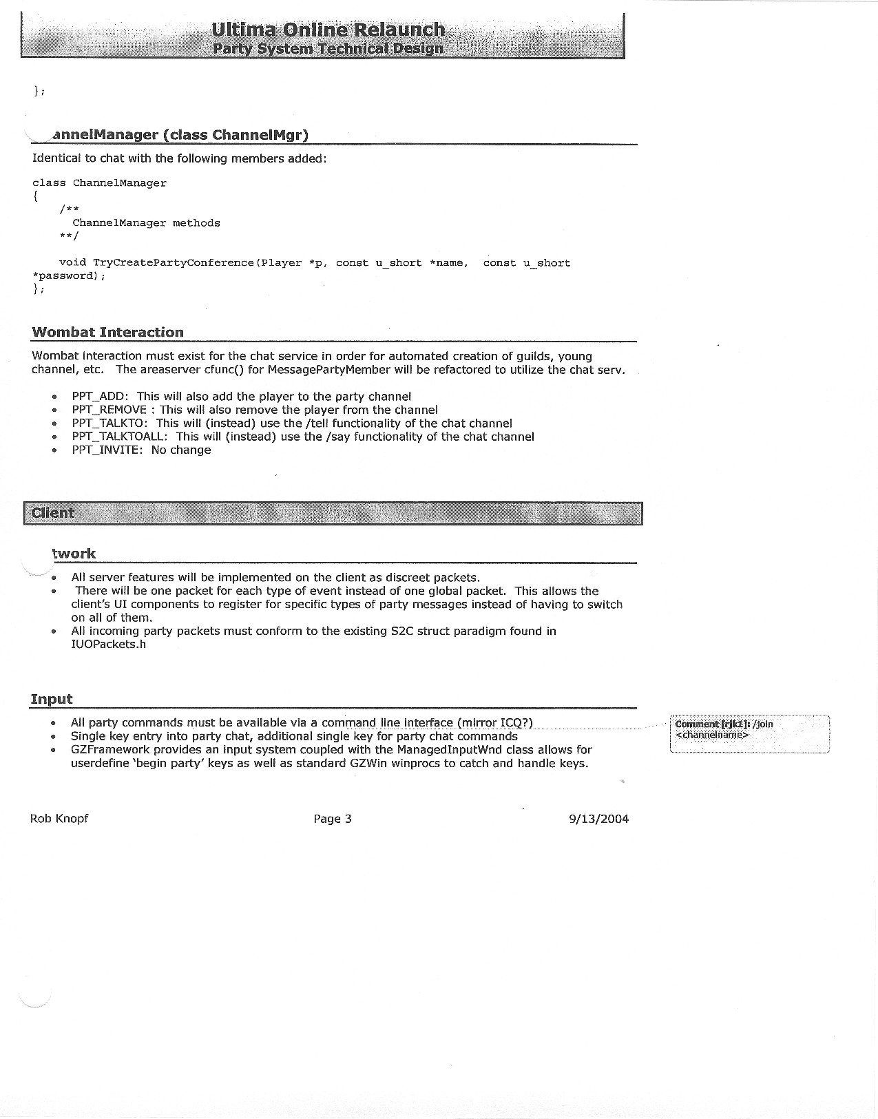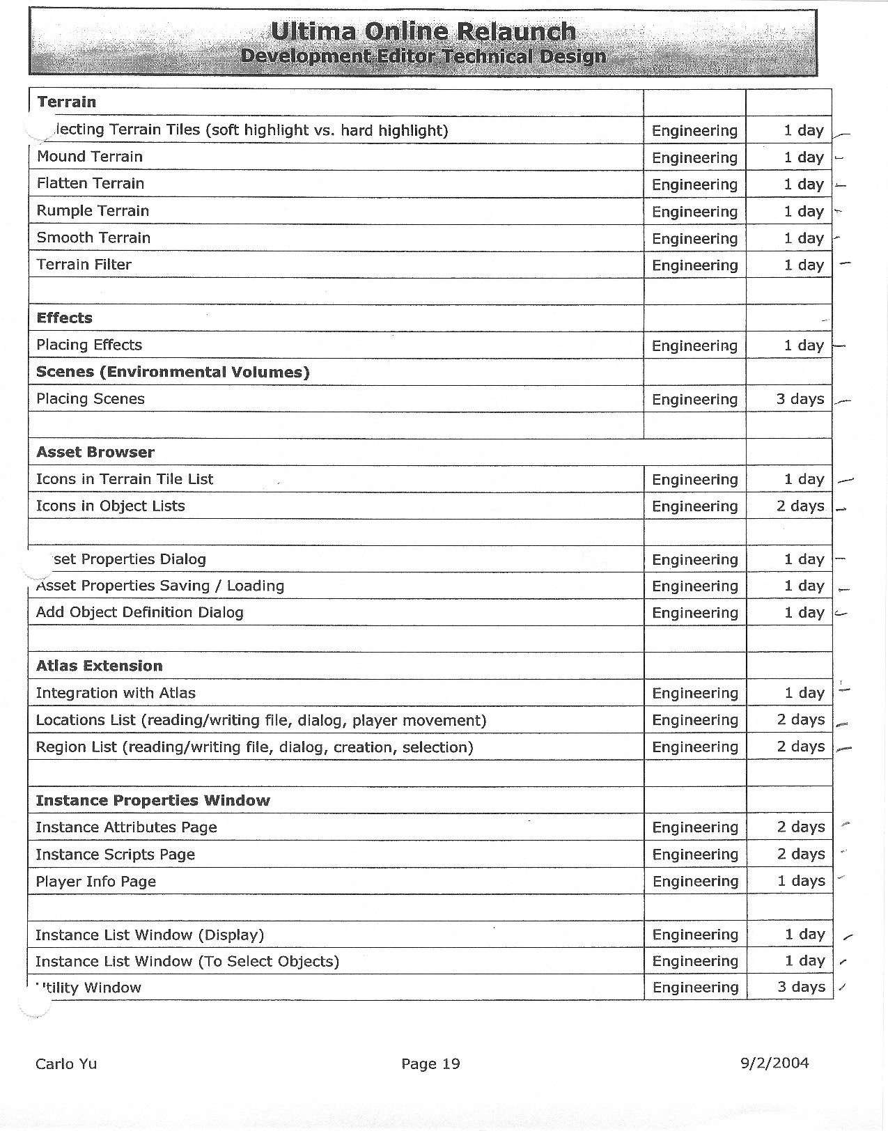 This document is dense, and disucsses almost all the technical details that would have concerned the Ultima Online 2 development team. Early in the document, for example, a comparison of different game engine technologies is performed, and it would appear that Maxis’ GZ engine (which powered The Sims 2, for example) had been chosen as the engine that would power the game. (The Renderware engine was chosen as a backup plan.) Later on in the document, the intentory UI and paperdolling system get discussed.