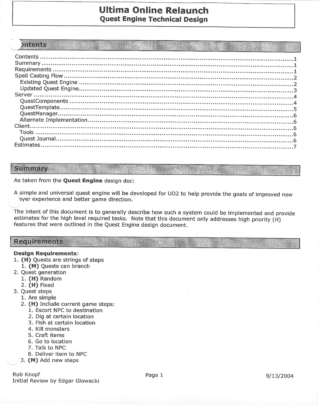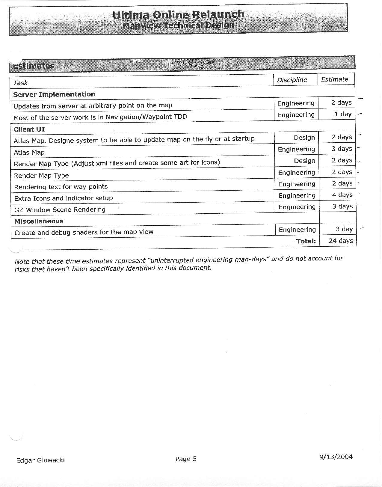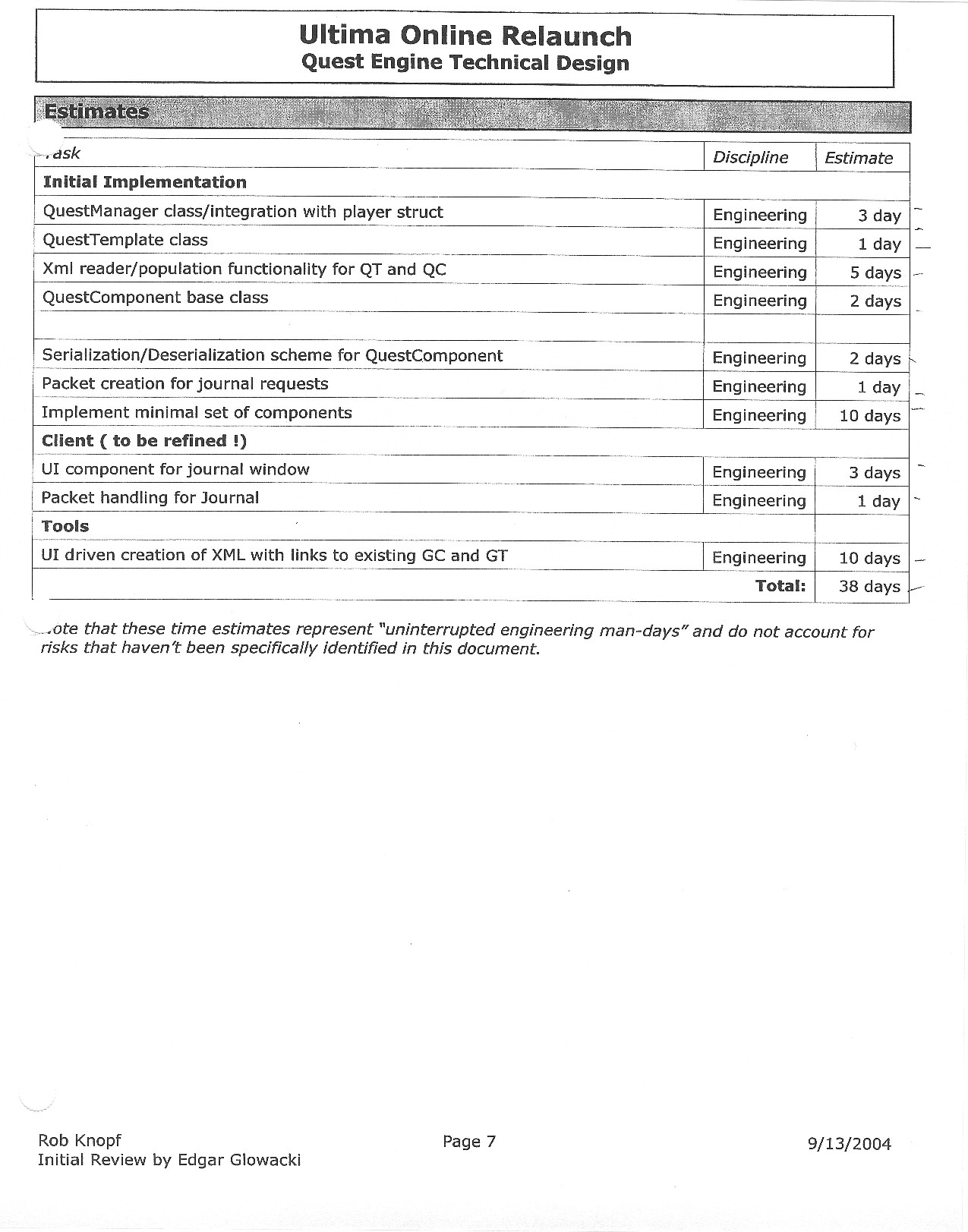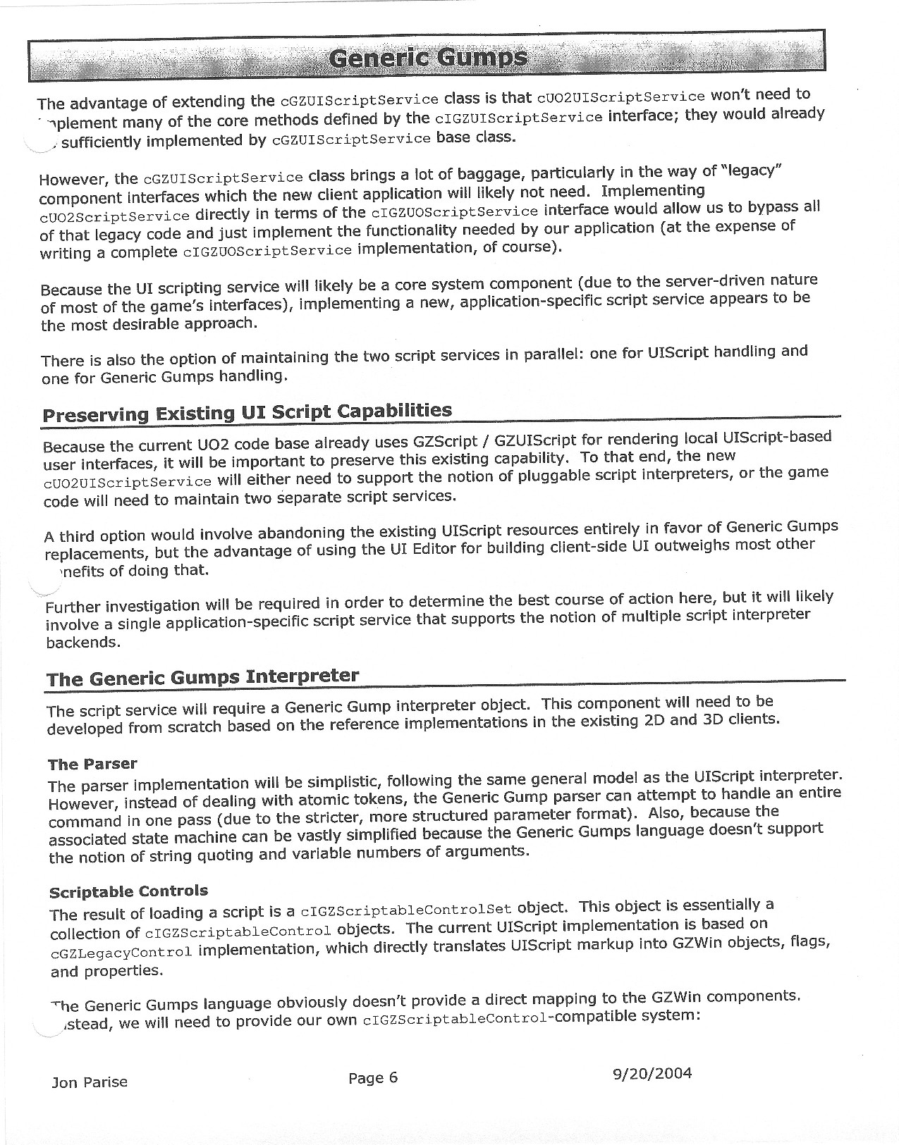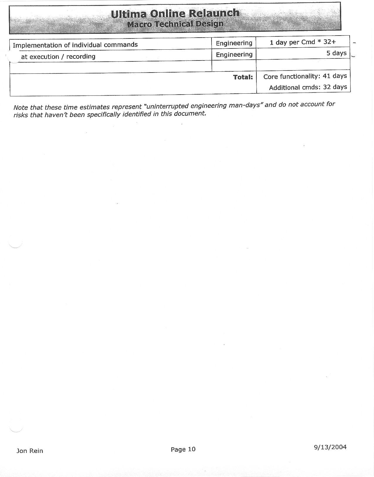 This document is dense, and disucsses almost all the technical details that would have concerned the Ultima Online 2 development team. Early in the document, for example, a comparison of different game engine technologies is performed, and it would appear that Maxis’ GZ engine (which powered The Sims 2, for example) had been chosen as the engine that would power the game. (The Renderware engine was chosen as a backup plan.) Later on in the document, the intentory UI and paperdolling system get discussed.